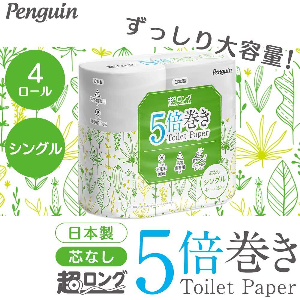 アイリスプラザ(IRIS PLAZA) ペンギン トイレットペーパー シングル 250m 4ロール (4ロールで20ロール分) 芯なし超ロング 長さ5倍巻 業務用
