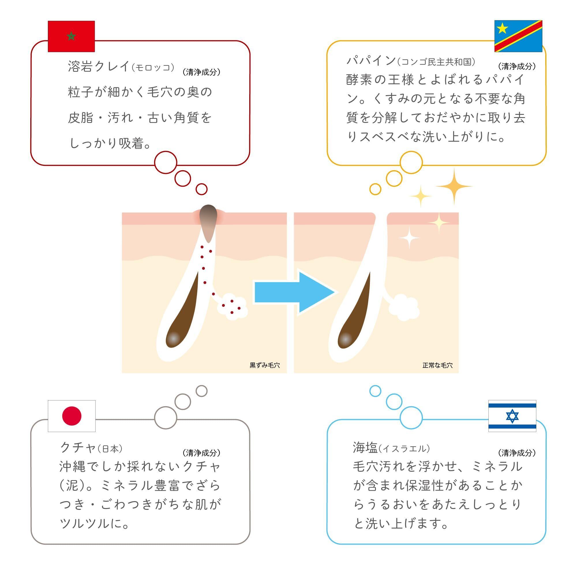 パパインの酵素と、溶岩クレイ、クチャの清浄成分が毛穴奥まですっきり、つるつるのお肌に導きます。