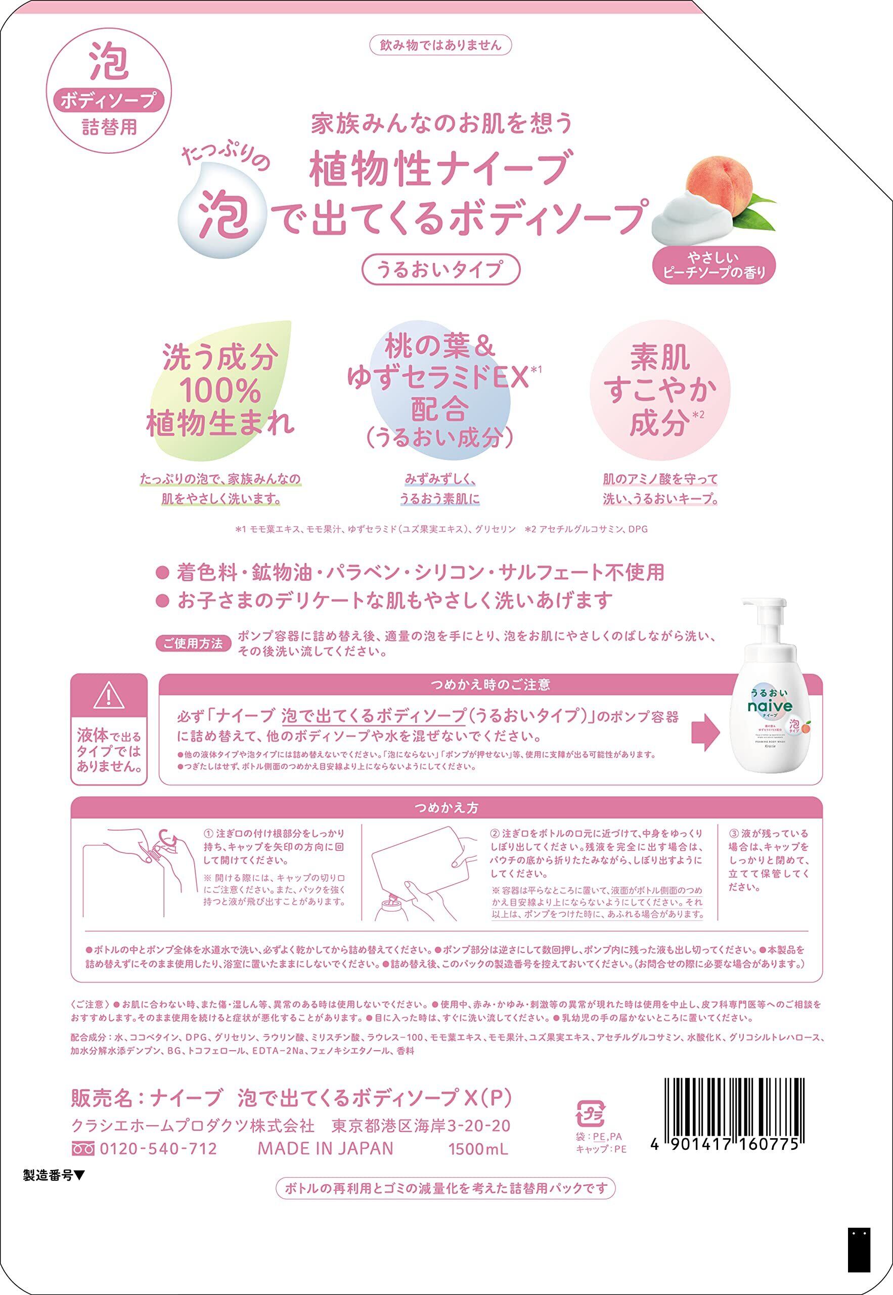 ●キメ細かい泡+1プッシュでたっぷり泡でやさしく洗える●洗う成分100%植物生まれ●桃の葉&ゆずセラミドEX配合。みずみずしくうるおい、なめらか素肌に●素肌すこやか成分配合。肌のアミノ酸を守って洗い、うるおいキープ●やさしいピーチソープの香り●着色料・鉱物油・パラベン・シリコン・サルフェート不使用 ●お子さまのデリケートな肌もやさしく洗いあげます●家族みんなでたっぷり使える詰替用特大量サイズ