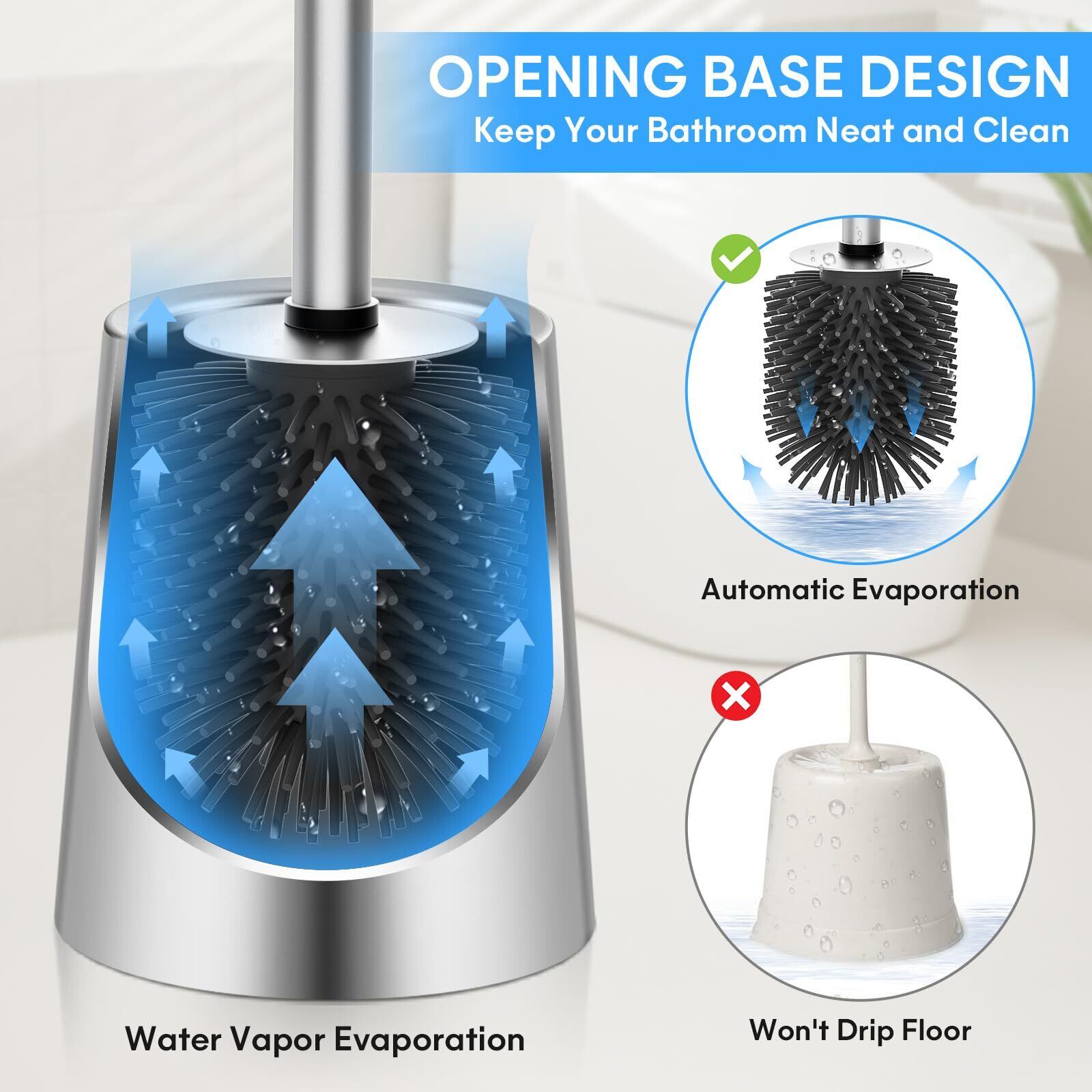 【高品質のシリコンブラシヘード】:高品質なシリコンのブラシは耐久性があり、硬度は適切で、トイレを傷つけません. ホルダーのボウルに挿入すると、剛毛が良好な状態に保たれるときに、シリコンブラシの形状が変化することはありません.
