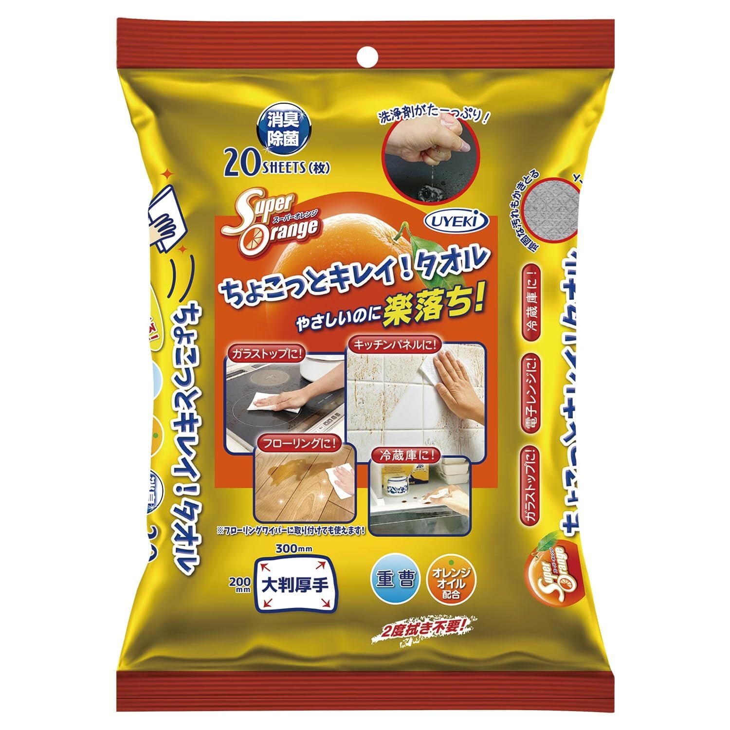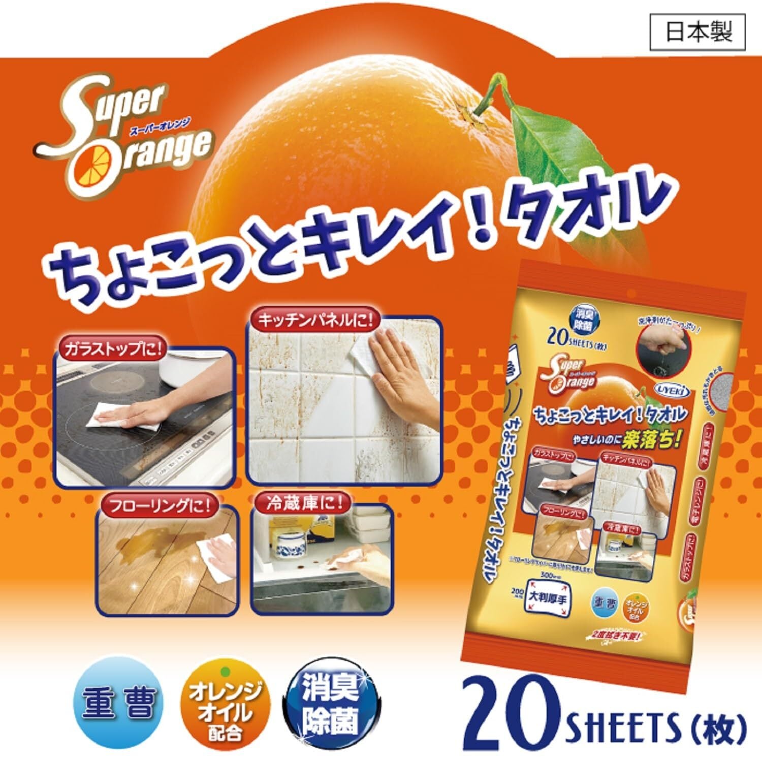 スーパーオレンジ ちょこっとキレイタオル キッチン掃除用 シート 重曹 オレンジオイル配合 20枚 ガンコな汚れ 鏡のウロコ落とし ふきこぼれ コゲ 水垢 水アカ 浴室 キッチン ガス台 レンジ ガラス 床 天然ヤシ油を主原料 界面活性化剤 オレンジオイルを配合 さび サビ落とし | kki