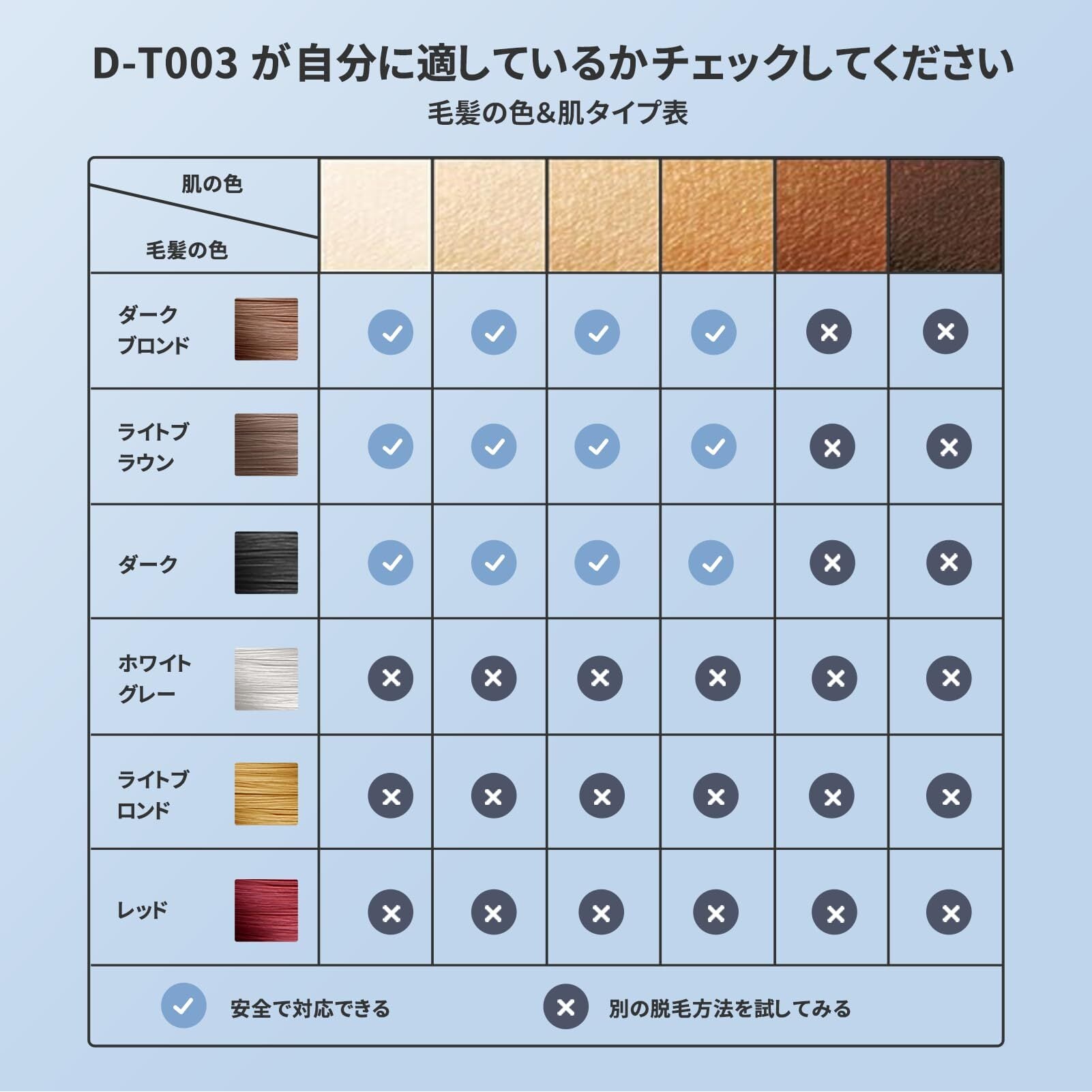【選べる5段階・最大21Jのパワー、ムダ毛悩みにさよなら】:D-T003だつもうき脱毛器は平面サファイア冷却技術を搭載されて、お肌への熱による刺激が抑えられるため、ワンショット最大21J(ジュール)という高出力での照射を実現しています。脱毛器は5段階レベル調節可能、レベルが高いほど出力が強く、効果も高いです。最大21J の出力で自宅でサロン級の体験が楽しめます。(初めてご利用の方は最初のレベル1からスタートしてください。)部位や肌の状態に応じて、5段階のレベル調節ができる脱毛器はメンズにも、レディースにも適しています。毛周期に合わせて照射、最短4週間で効果が見られます。ムダ毛の悩みから解放し、自信のついた毎日を楽しみましょう!