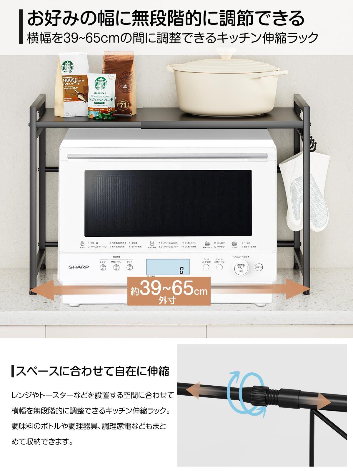 電子レンジ上のデッドスペースを有効活用できる伸縮キッチンラック:レンジ上ラックは、約幅36cm~65 cm(内寸)で無段階調整できる、可動棚板は約5.5cm間隔で3段階で高さ調節可能です。レンジの大きさや収納物の量、置く場所の広さなどに合わせたご家庭のキッチンにちょうどいい形で設置していただけます。サイドバーを4個s字フックなどを使用した吊り下げ収納に使えます。レンジラックとして使えるし、洗面台の下の棚としても使える、リビングでも使えます。オーブンレンジラックは黒と白、2カラーがあります。