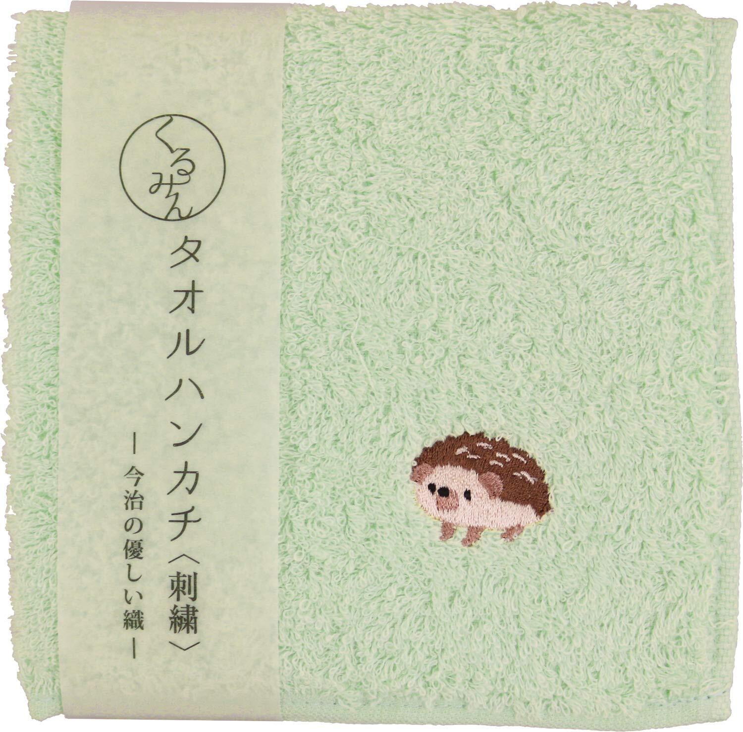 京佑 日本製 今治 刺繍 ハンカチ 約25cm×25cm ハンド タオル ウォッシュ ミニ 綿 くるみん はりねずみ 緑