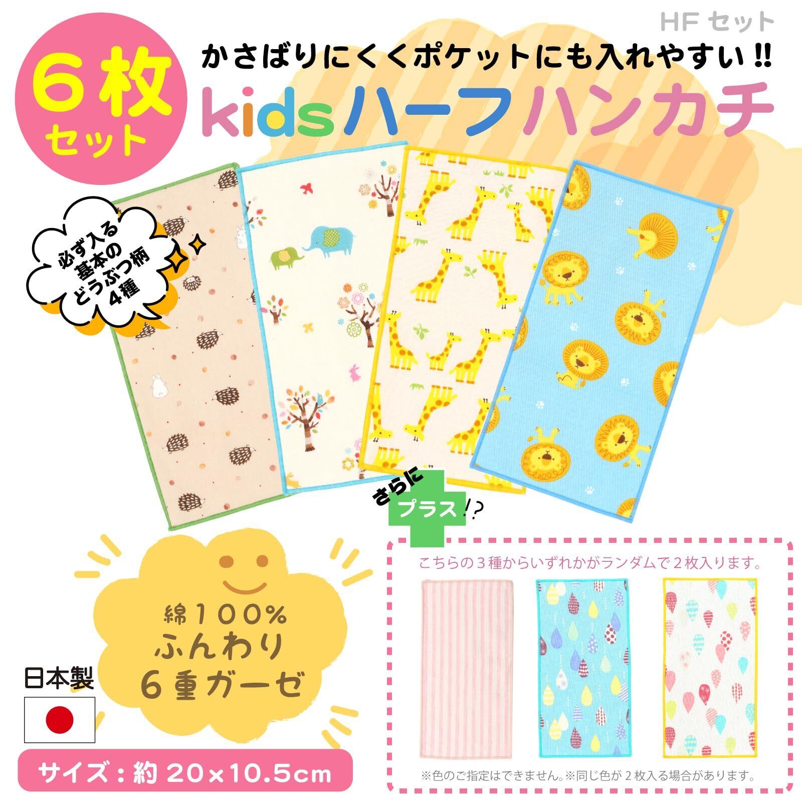 キッズ ハーフハンカチ 6枚セット 日本製 綿100 ふんわり 6重ガーゼ 男の子 女の子 ガーゼ ハンカチ はんかち 子供 子ども こども かわいい柄 半分サイズ 幼稚園 保育園 入園 小学生 HFセット
