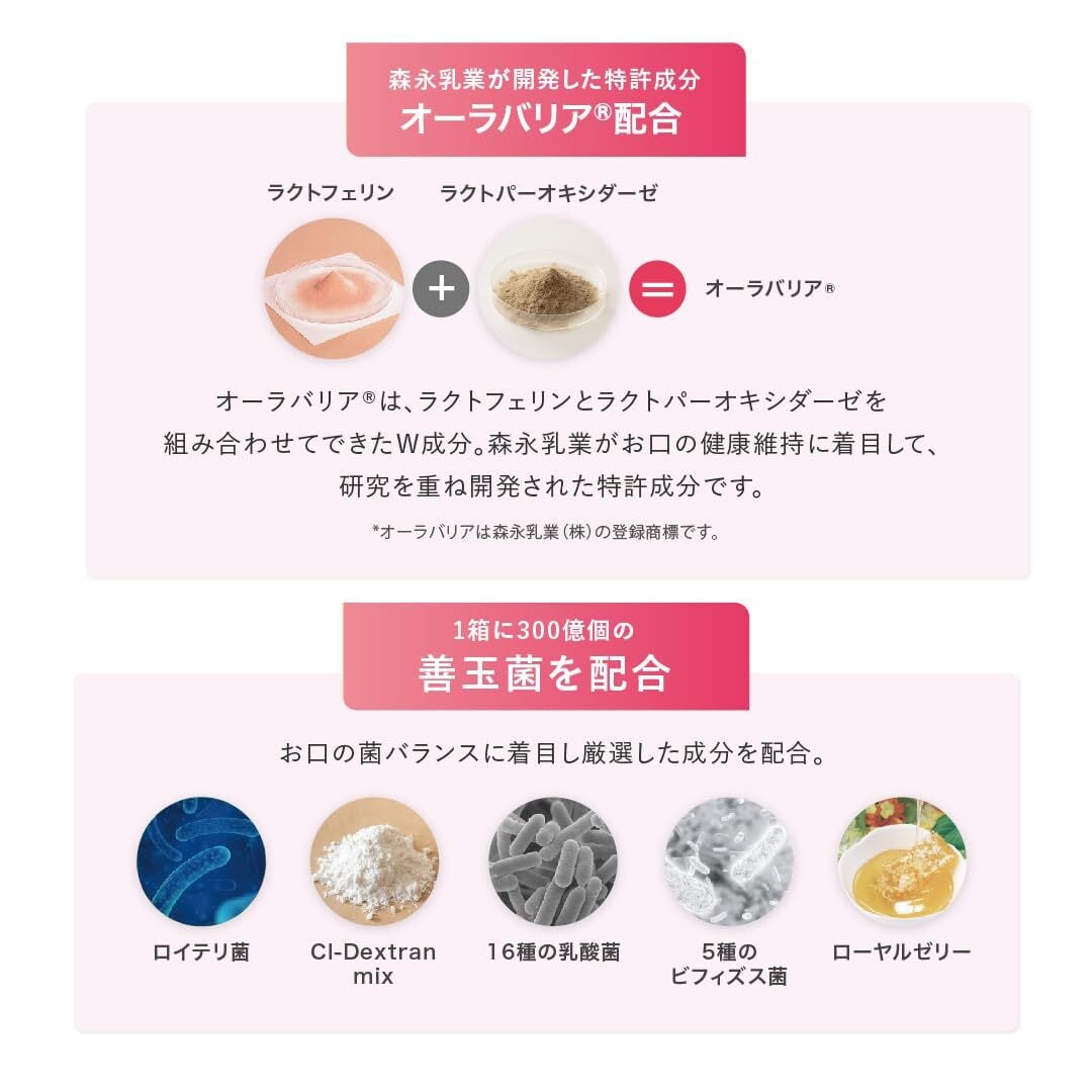 話題のロイテリ菌をはじめ、16種の乳酸菌、5種のビフィズス菌、オーラバリアなど口内フローラに着目し、厳選した成分を配合。