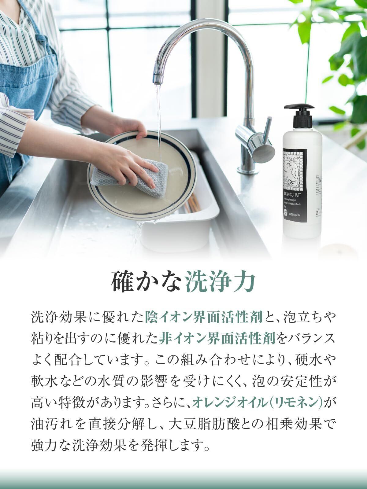 【特徴】 強力な洗浄力と人体・環境負荷の低減を実現!植物が有する様々な洗浄作用をバランスよく配合し、食器の汚れを簡単に落とせます。毎日使うものだからこそ、お肌に対する負担を軽減し、自然環境下に残留しないものが望ましいですよね。