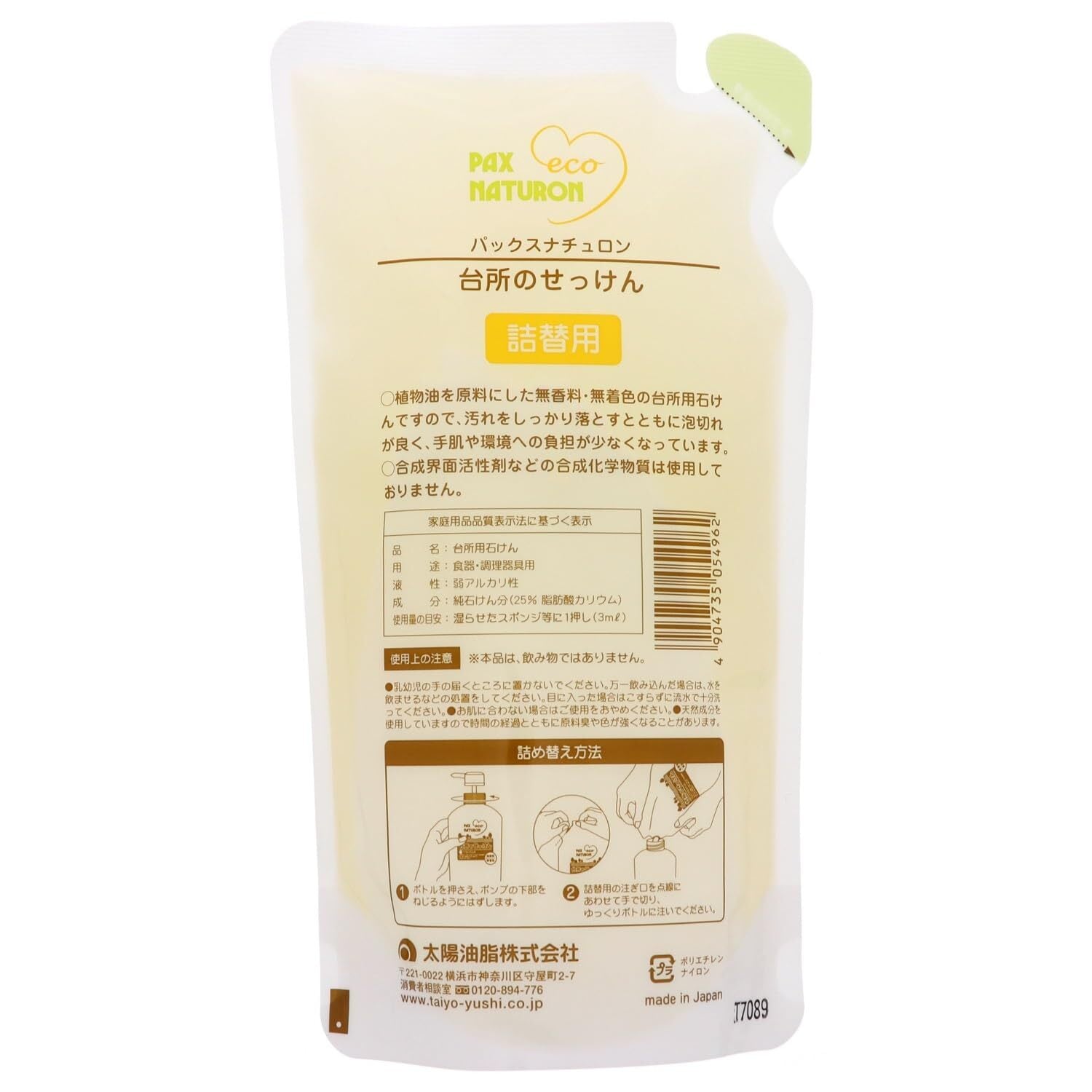 パックスナチュロン 詰替用 台所のせっけん (食器洗い石けん) 450ml キッチン 洗剤 無添加 天然由来100% オーガニック 太陽油脂