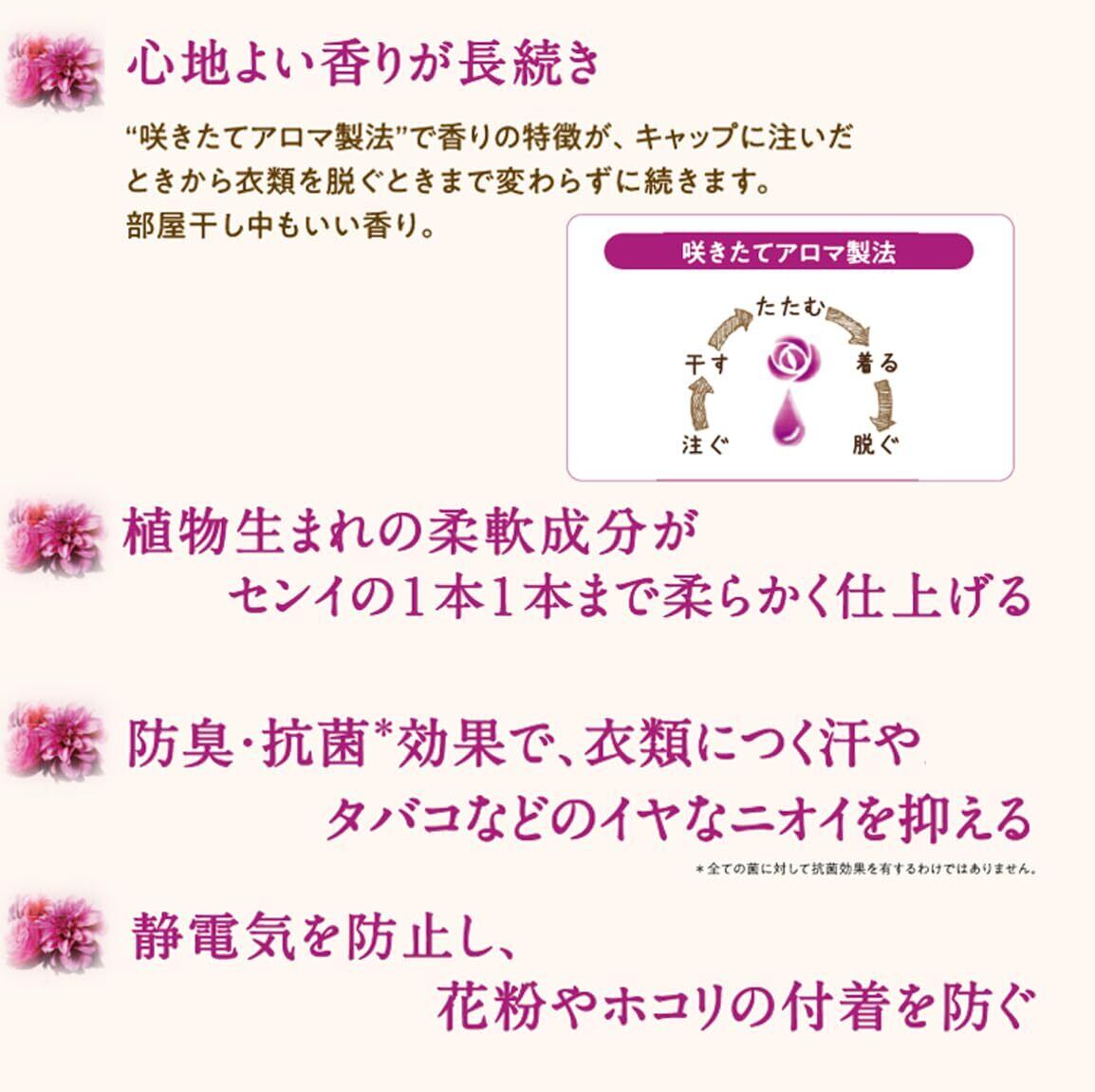 【あなたが選んだときの香り、変わらず続くのはただひとつ。唯一(※1)、裏切らない香り】 ・“天然スイートオレンジオイル"配合。 ・植物生まれの柔軟成分がセンイの1本1本まで柔らかく仕上げ、静電気も防ぎます。 ・防臭・抗菌(※2)効果で、衣類につく汗やタバコなどのイヤなニオイを抑えます。 ・赤ちゃんの衣類もやわらかに仕上げます。 ・部屋干し中もいい香り。 ・月夜に恋人を待つロマンティックな女性をイメージした、スイートフローラルアロマの香り「Juliette(ジュリエット)」 バニラやスイートアンバーの甘美な香りに月下香やミュゲのフローラルを加えた、ロマンティックな奥深い香り。 (※1)ソフランアロマリッチ内(従来品含む)・選んだときの香りの特徴が、注ぐときから脱ぐときまで、ずっと変わらずに続く“咲きたてアロマ製法"。 (※2)全ての菌に対して抗菌効果を有するわけではありません。 原材料・成分 界面活性剤 (エステル型ジアルキルアンモニウム塩)、安定化剤、香料 使用方法 【全自動洗濯機の場合】柔軟(仕上げ)剤自動投入口に本品を入れて洗濯する(すすぎ時に自動で投入される)。 【二槽式洗濯機、手洗いの場合】すすぎの水がきれいになったら本品を入れ、約3分まわすか、ひたした後、脱水する。 *洗濯機の設定に「ためすすぎ」と「注水すすぎ」がある場合は「ためすすぎ」を選んでください。 ご注意(免責)>必ずお読みください ご注意(免責)> 必ずお読み下さい 在庫完売の際は、お取寄せ又はキャンセルとなる場合がございます。また、Amazon配送予定日と商品お届け予定日は異なる場合もございますので予めご了承下さい。 商品は予告なくパッケージ変更の場合もあります。※お客様都合によるご返品はお受けできません 続きを見る