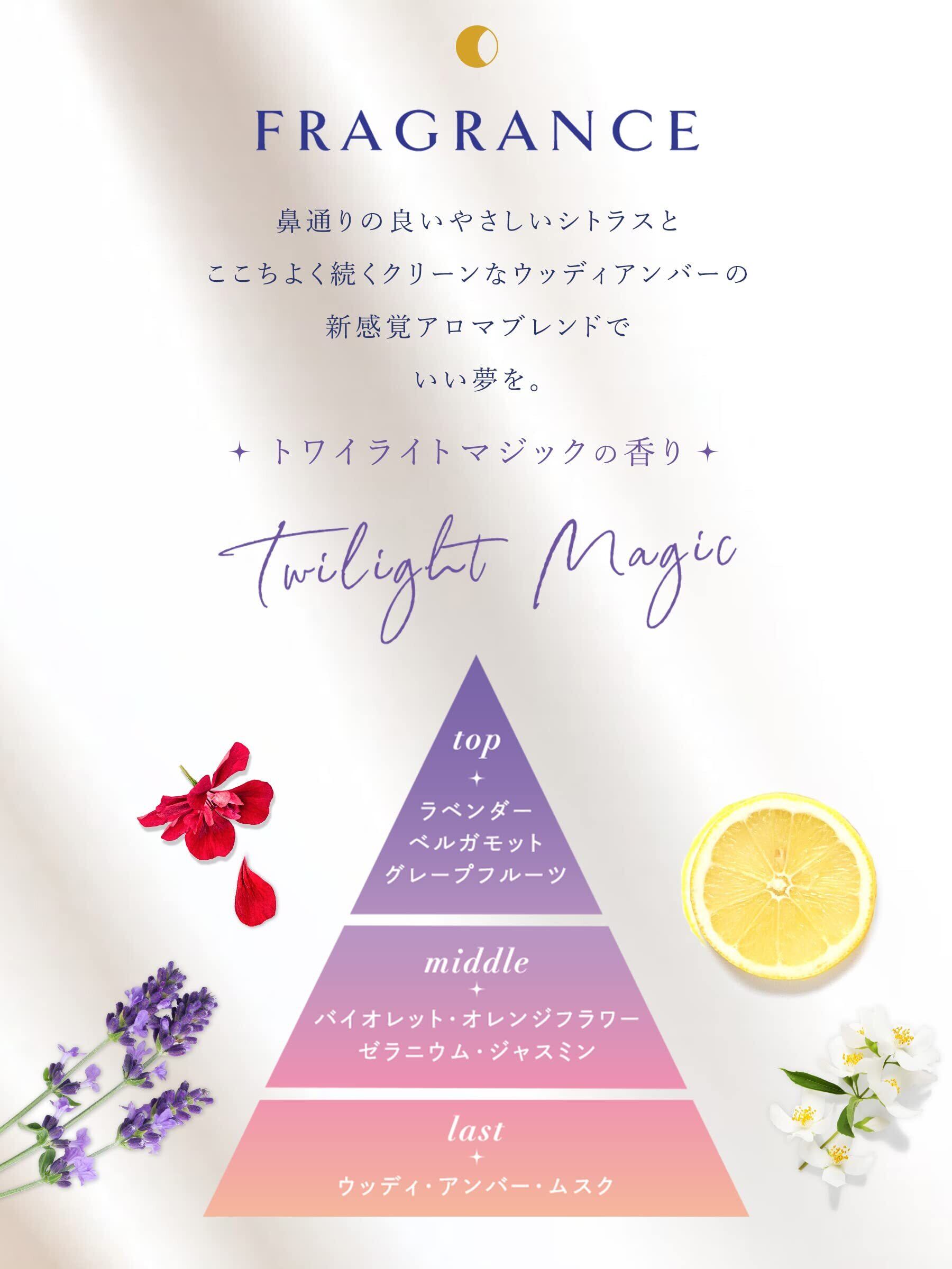 クリアなアンバーとやさしいシトラスの新感覚アロマ、トワイライトマジックの香り。心ほぐれるリラックスタイムをお楽しみください。