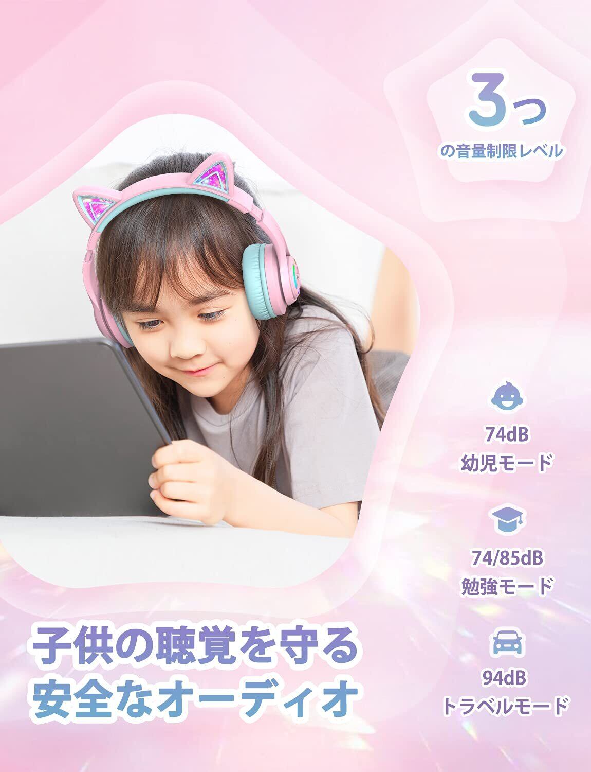 iClever 子供用ヘッドホン Bluetoothヘッドフォン 猫耳LEDライトアップワイヤレスキッズヘッドフォン 音量制限付き(74/85 dBA) 45Hプレイタイム マイク付き 学校/タブレット/PC用 BTH13 ピンク | kki