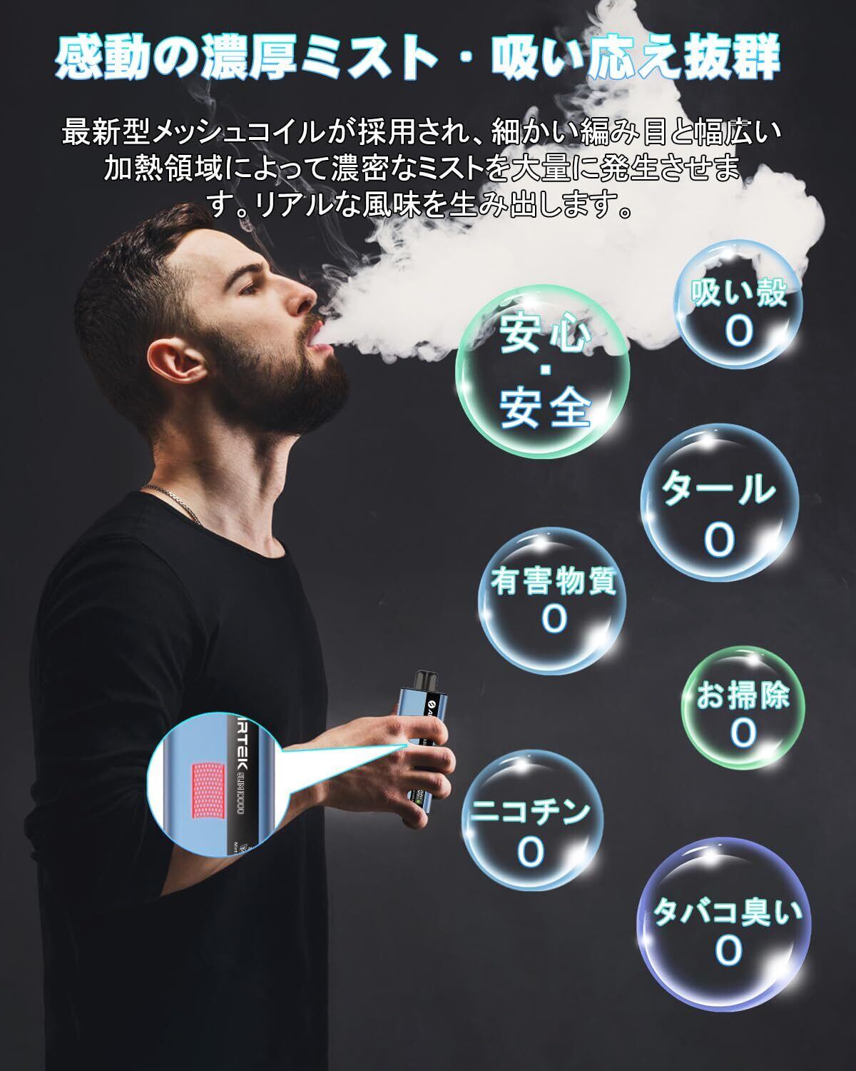 【驚きの10000回使用回数】1本で約10000回吸引できる大容量電子タバコ、従来のたばこ50箱分相当。普通の電子タバコに比べて 手軽に使えるのに煙量も満足のできるvapeです。禁煙ながらタバコ代も十分に削減出来ます。700mAhのバッテリーが内蔵されるベイプは、長時間に喫煙できます。電子タバコ本体の底面にType-C充電ポートがあるため、フル充電で約40分かかります。使い捨てながら充電は繰り返し可能!最後までフレーバーの風味を最大限お楽しみいただる。※吸引口数は吸う時間の長さと強さ等によって個人差があります。