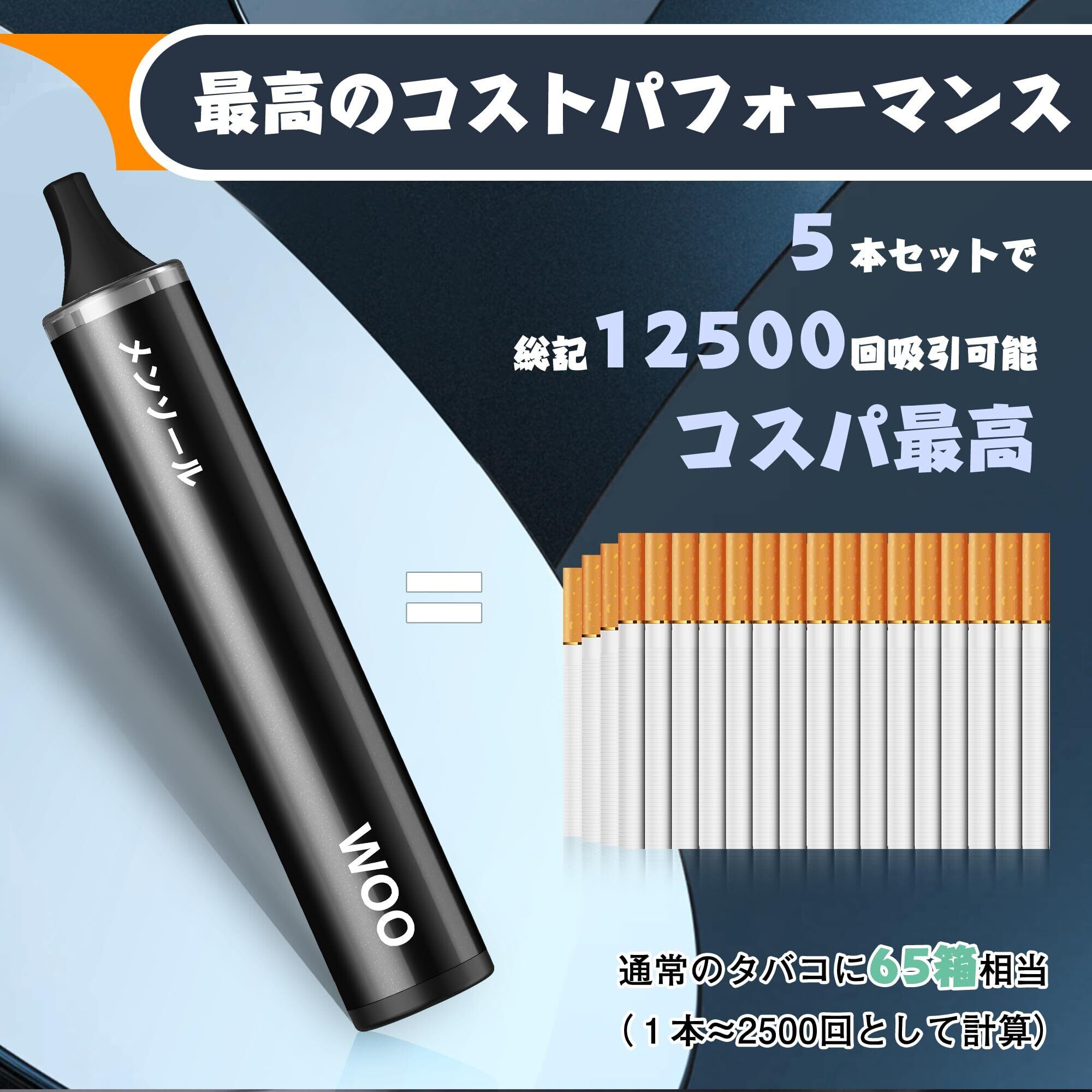 【12500吸引可能】5本セットで最大12500回吸引可能の大容量電子タバコです。12500回吸引回数は通常のタバコ65箱に相当、簡単にタバコ代を節約できます。お金を節約したい人にとっては大チャンスです。他の電子タバコと比べて煙の量が多く、吸い応えが抜群です。更に吸った後、紙タバコに近い満足感を得ることができます。