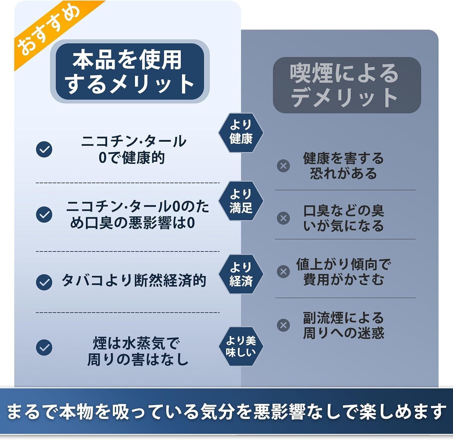 【禁煙·減煙に助ける】ニコチン・タールは含まれていないので健康に害なく吸えます。フレーバーは5種類があり、お好みのフレーバーを選べば禁煙も楽になります。甘くて美味しいフレーバーのベイプを使用すればその口寂しさを紛らわすことができ、ストレスを軽減しながら禁煙に挑めるかもしれません。禁煙することで、ストレスが発生する負のループから抜け出せて、爽やかな気分で生活をすることができます。