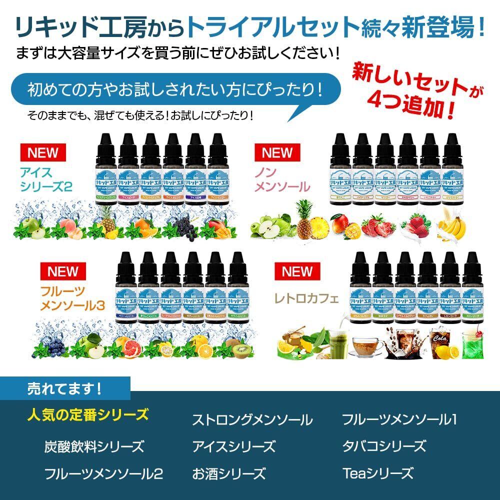 【リキッド工房の10mlお試し6本セット好評発売中】みなさまからの【気になるフレーバーを少量サイズのリキッドで試したい】という声から商品化しました。90種類以上のフレーバーから人気のアイスグリーンアップル、アイスピーチ、アイスパイナップル、アイスオレンジ、アイス巨峰、アイスマンゴーの6種類をお試しセットで販売。アイスシリーズがセットになった商品です。