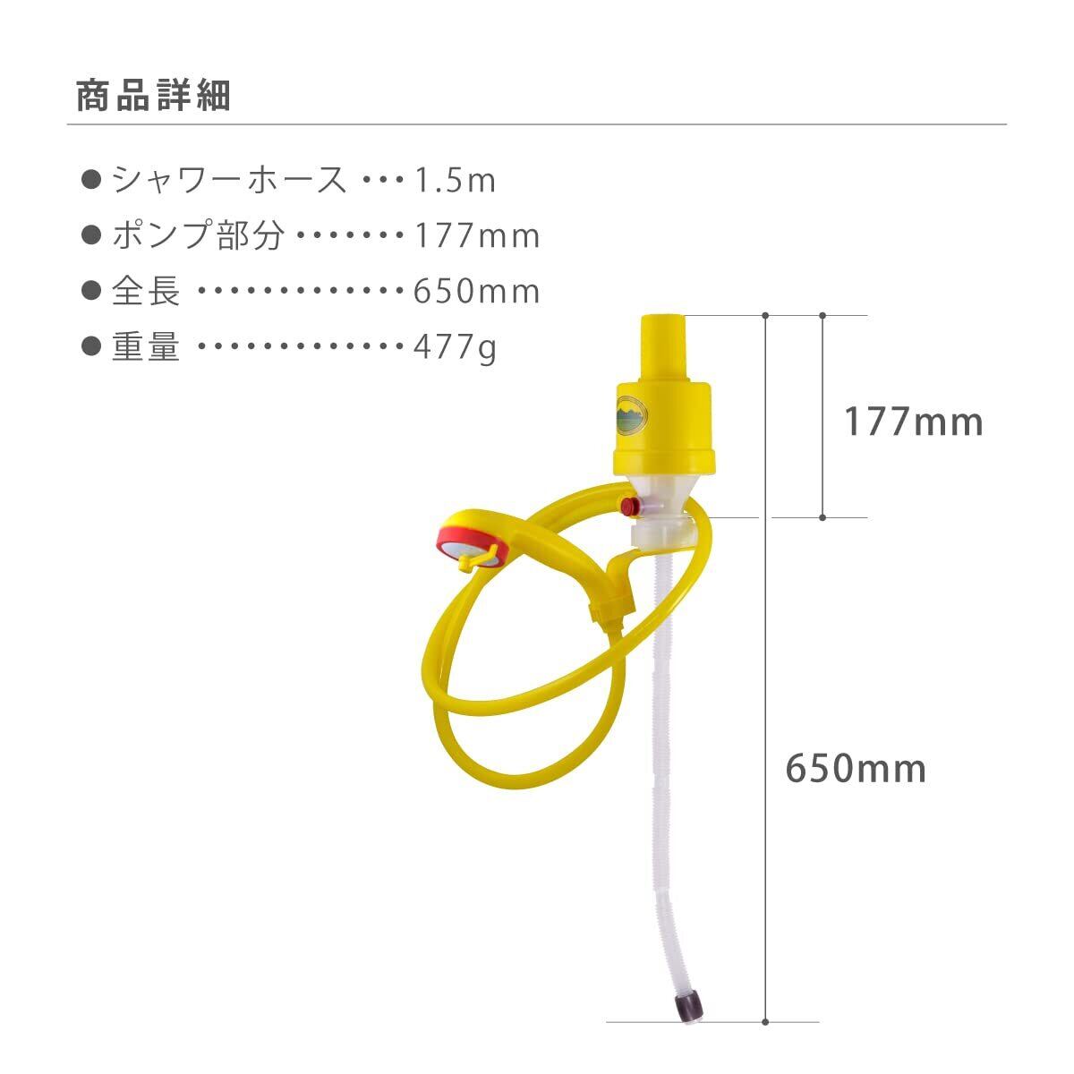水道のない場所でも使える ポリタンクに水を溜めておけば手軽にシャワーが使えアウトドアにおすすめな商品です。 電池不要の空気圧ポンプ 本体上部を20回程度ポンピングし、タンクに空気を送り込むと空気圧でシャワーがでます。 便利な止水機能 手元のレバーをスライドさせると通水・止水の切替えができます。 水漏れの心配はいりません 使用後は赤いエアー抜きボタンでタンク内の空気を抜くことで残圧による水漏れを防ぎます。