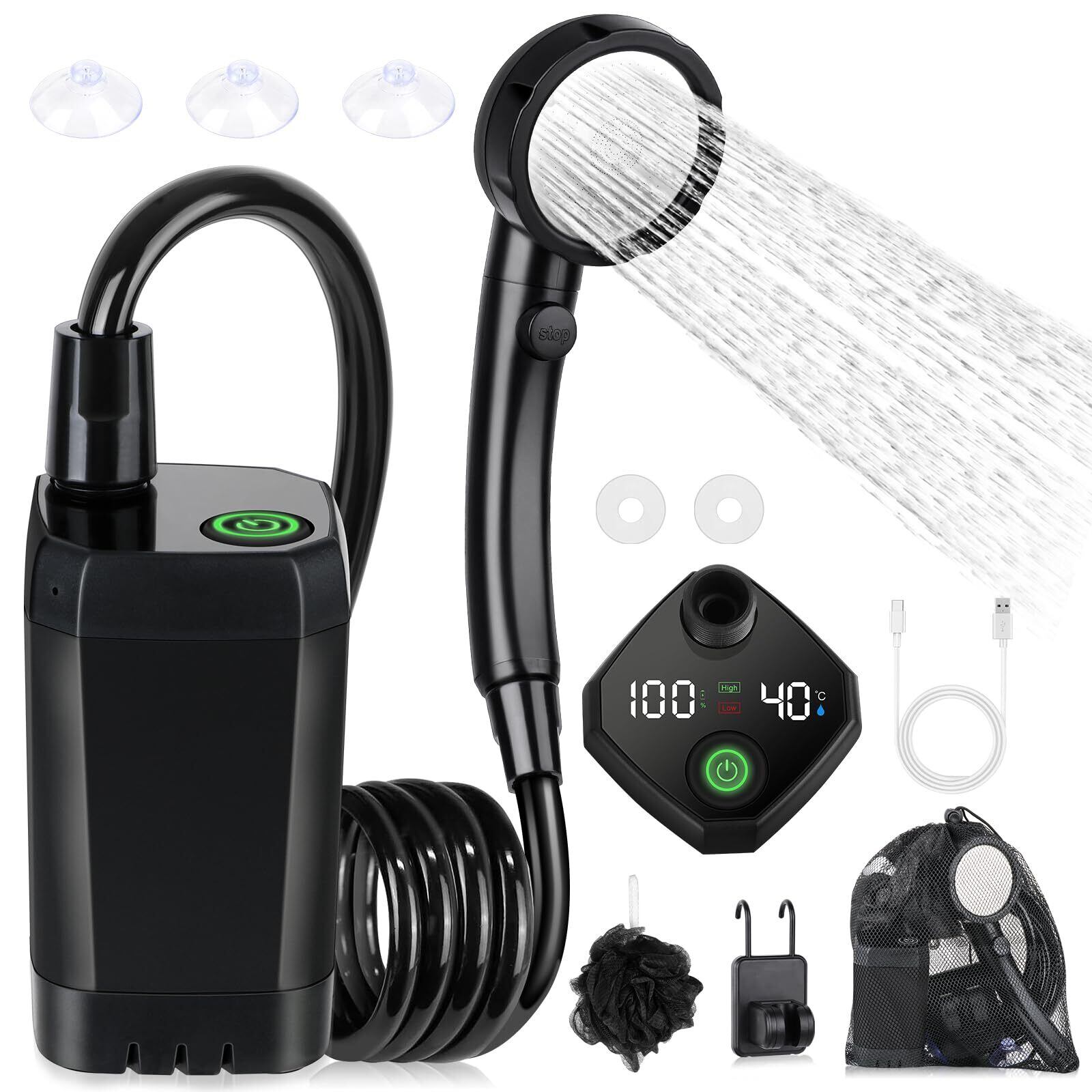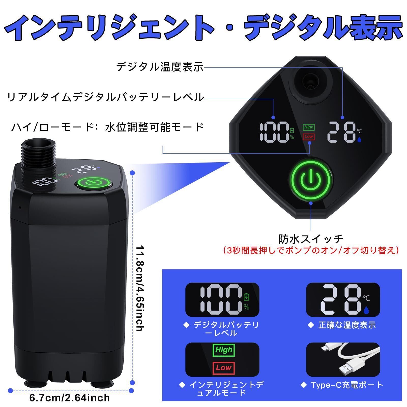 【デジタル表示付き - 注意:加熱機能なし】ポータブルシャワーは0〜60℃の水温に適しています、ポンプは水を加熱する機能はありません。シャワーポンプは水温と電力状態をリアルタイムで表示するデジタルディスプレイを搭載しており、現在の水温と使用電力レベルを把握しやすく、適度な水温でシャワーを楽しむことができ、キャンプ用シャワーポンプの消費電力を把握することができます。