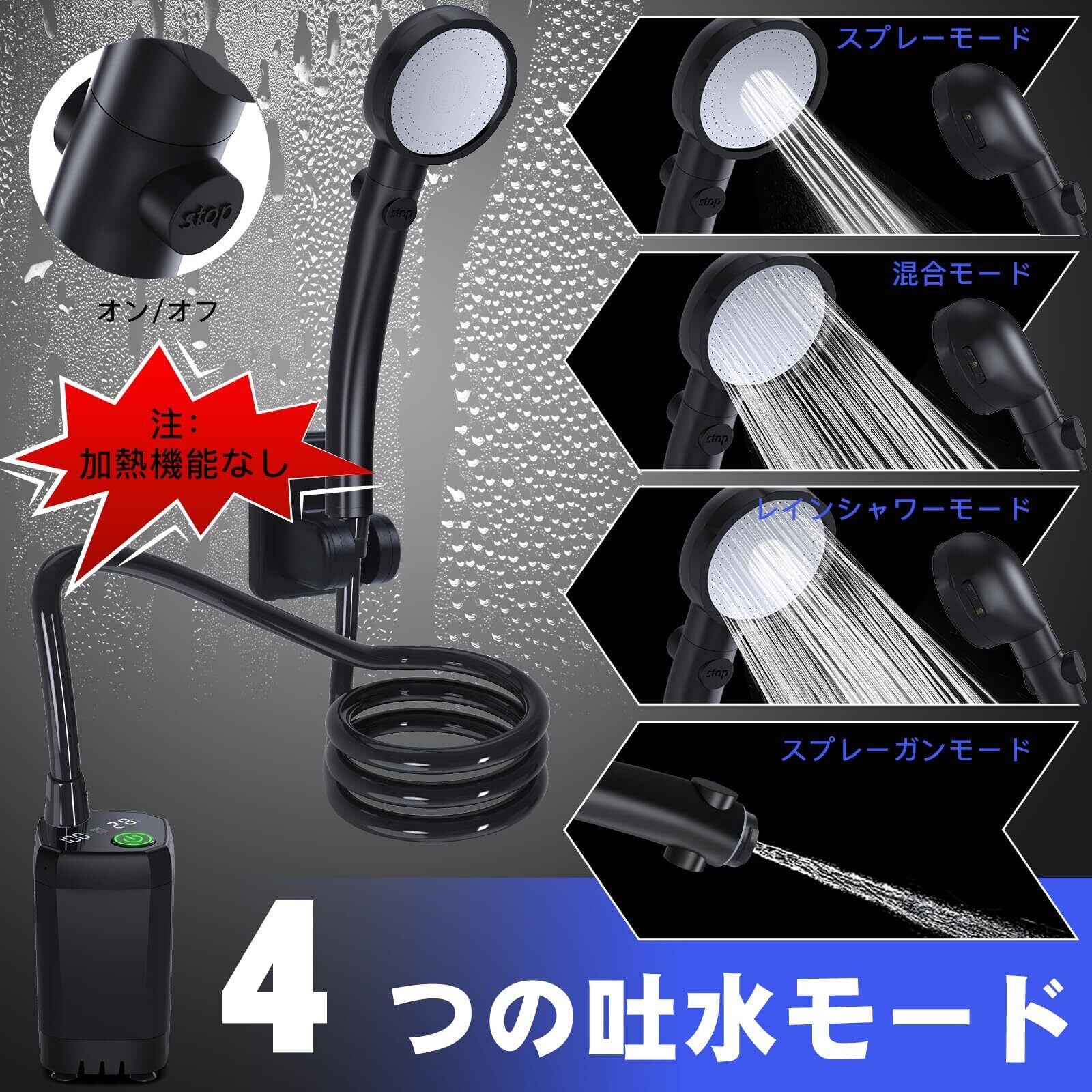 【4つの排水モード】キャンプ用ポータブルシャワーヘッドは実用的な4つの排水設定を搭載しており、様々なシーンでニーズに合わせてモードを切り替えることができます;水流調整ノブを調整することで無段階に水流を調整することができ、水流を自由にOFF/ONすることも可能です。また、アップグレードされたモーターは低騒音で作動し、アウトドアキャンプのシャワーに静かな環境を確保します。