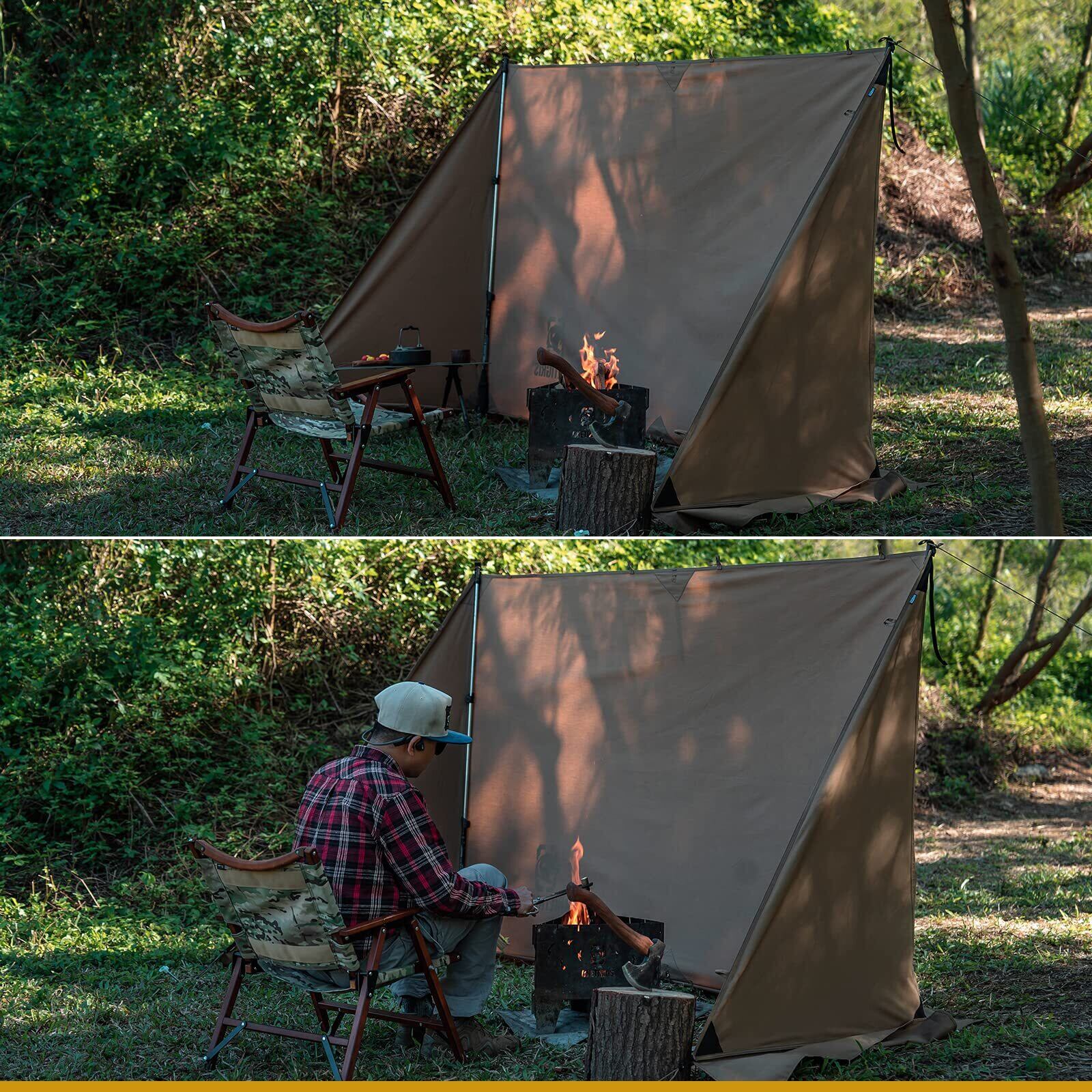 【大型焚き火用陣幕】人が多いキャンプ場でソロベースを作りたいなら、このキャンプ陣幕はご覧下さいましょう。この大型前幕は長さ218cm、高さ130cmの長方形のエリアに囲むことができます。焚き火の風除けとして使えるだけでなく、キャンプでは目隠しとして使い、プライバシーを実現できます