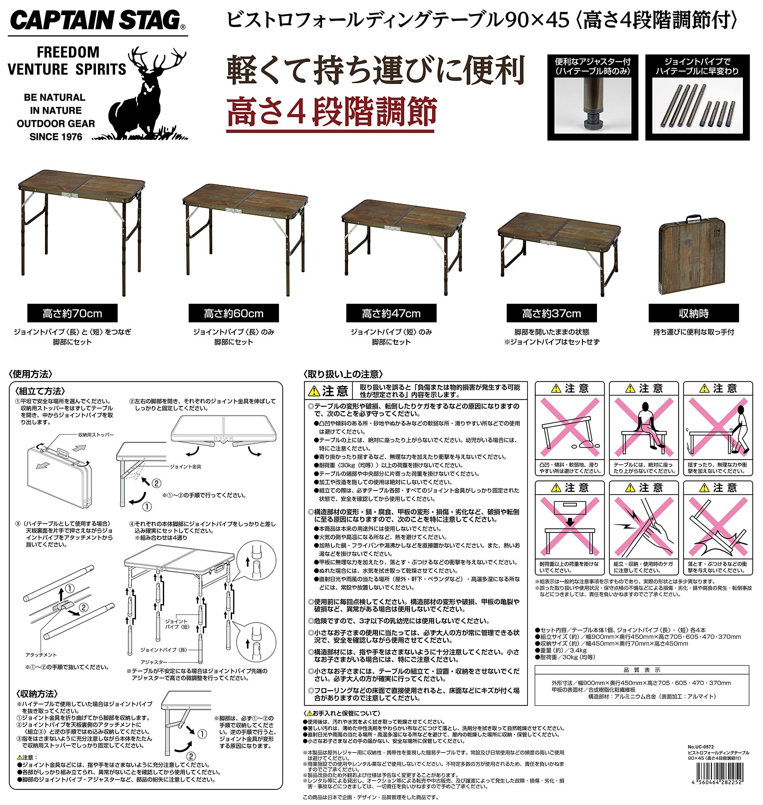 キャプテンスタッグ(CAPTAIN STAG) アウトドアテーブル テーブル フォールディングテーブル 【90×45cm(2~4人用)】 【120×60(4~6人用)】 高さ4段階調節可能 アルミ製 ビストロ UC-571/UC-572