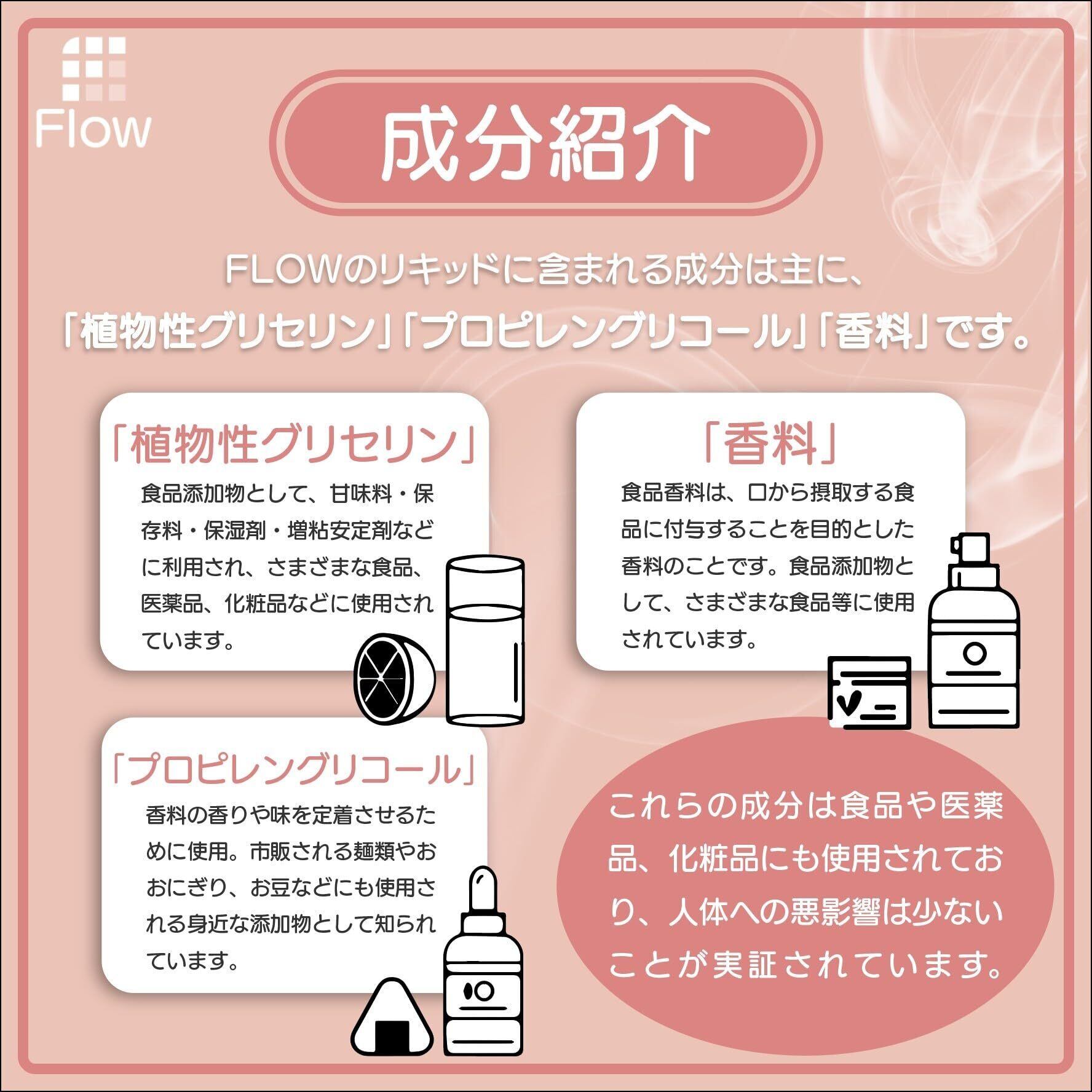【安心・安全】 FLOWは全てニコチン・タール無し、有害物質は一切使用していないため、受動喫煙や副流煙もありません。