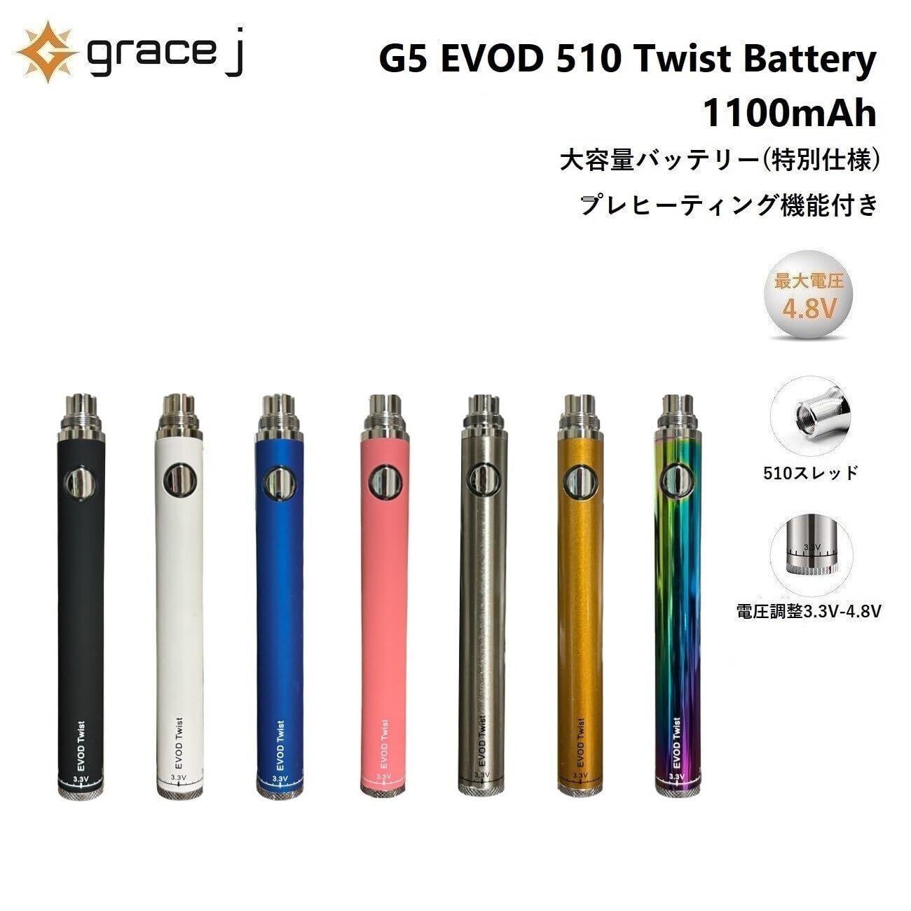 【大容量バッテリー搭載 ヴェポライザー】当社オリジナルブランド「Grace J 」から、G5 ツイストバッテリーが発売されました!G5は、1100mAhの大容量バッテリーを搭載し、7種類のカラーをラインナップした『特別仕様』の ペン型バッテリー です。