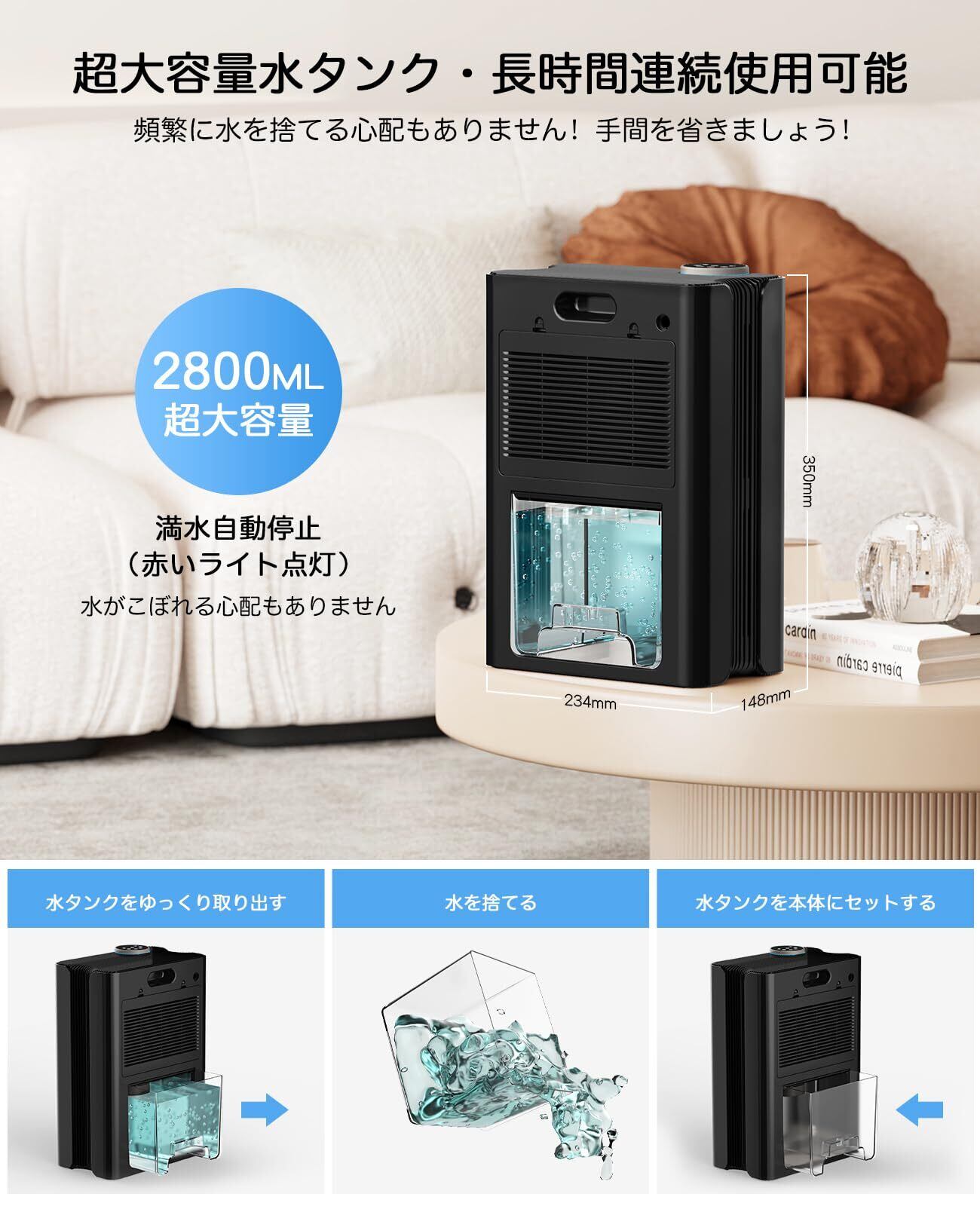 【2800ML大容量水タンク・満水自動停止】取り外し可能な2800ML超大容量透明水タンクが付き、頻繁に水を捨てる必要がなく、手間が省けます! 除湿機には水観察口が装備されており、いつでも簡単に除湿量を確認できます。除湿中に満水になると赤いランプが点灯し、自動で電源がオフになります。 不在時でも水が溢れて床を濡らす心配はありません! ご注意:電源を入れると水タンクを取り出す際に警告音が鳴り、3~5秒後に自動的に停止します。