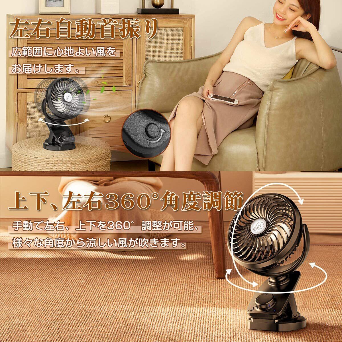 【自動首振り&最大60時間連続使用】 扇風機 小型 充電式 卓上風量無段階調節 5000mAh充電池内蔵 360度角度調整 usbクリップ ミニ 強風 静音設計 アロマ対応 直径14.5cm ブラック