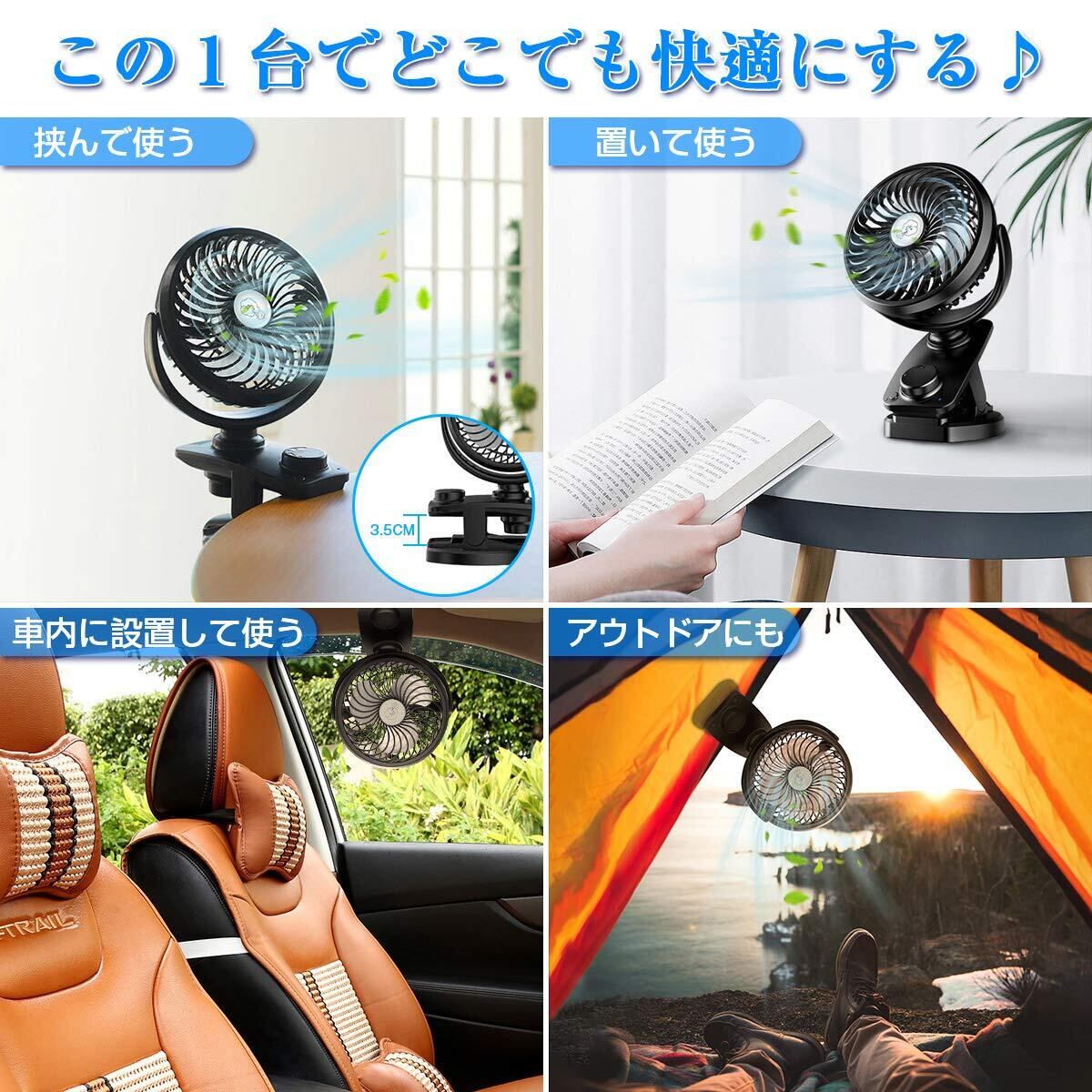 【自動首振り&最大60時間連続使用】 扇風機 小型 充電式 卓上風量無段階調節 5000mAh充電池内蔵 360度角度調整 usbクリップ ミニ 強風 静音設計 アロマ対応 直径14.5cm ブラック | kki