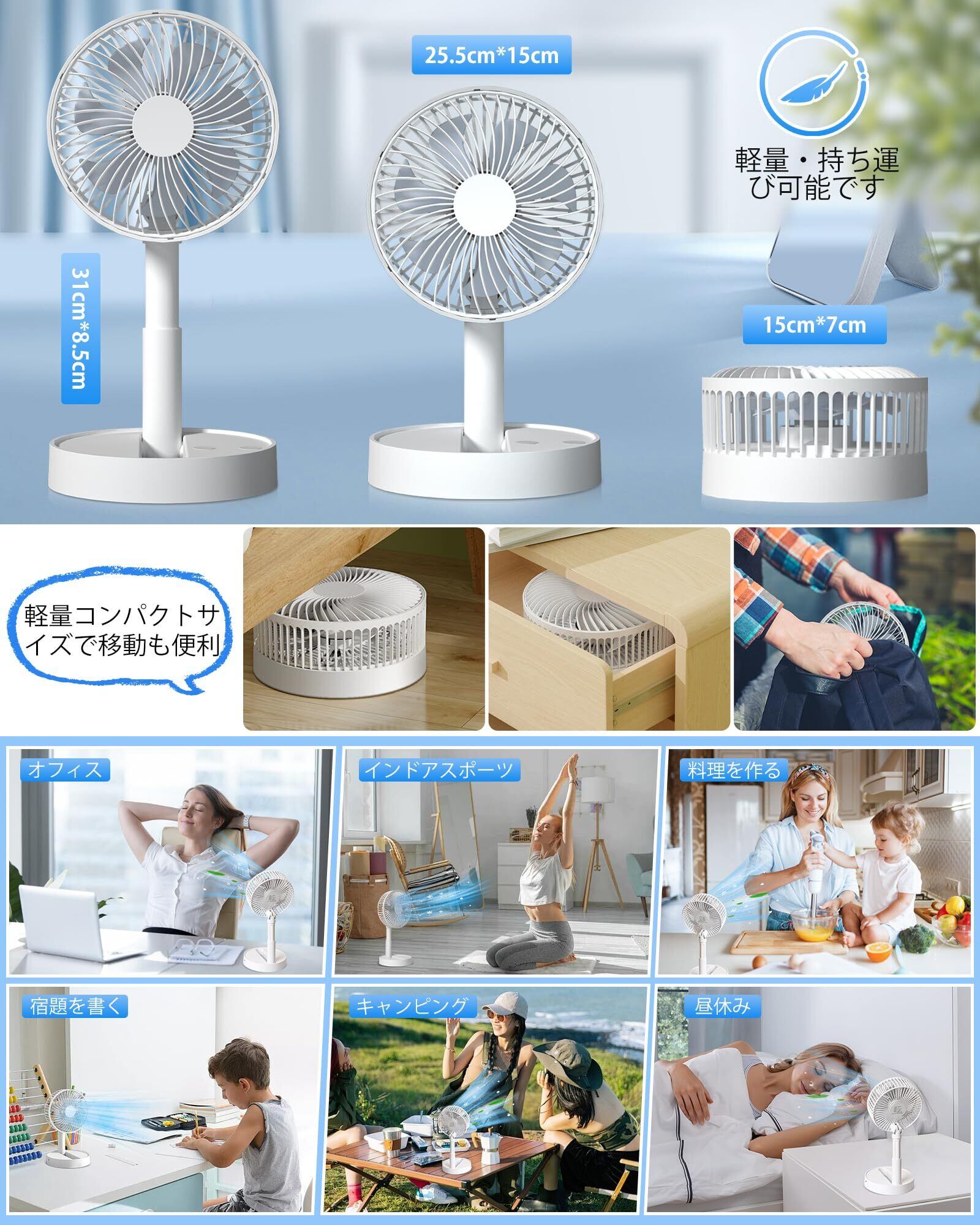 ❉彡【コンパクトサイズ・持ち運びやすい】卓上ミニ扇風機本体サイズ:W17.5×D8.3×H22.1cm / 本体材質:ABS / 重量:本体450g/ カラー:ホワイト&ブラック/ 充電容量:4000mAh / 電圧:DC5V/1A / 消費電力:2.9W / 風量:4段階 / 取扱説明書。夏にはエアコンの効率を向上し、脱衣所や洗面台や風呂上がり、キャンプなどいろいろなシーンで活躍しています。同時に手元に電源があれば充電しながら使うこともできます。々なシーンにも活躍、室内:リービング、キッチン、寝室、お風呂場、部屋内の換気、図書館、事務所、職場、会社、オフィス内、ジム、電車、バス、車の中、エアコンと合わせ使用。アウトドア:キャンプ、車中泊、ツーリング、お花見、花火大会、お祭り、バービーキュー、海、海水浴場、プール、ピクニック、遊園地、野球観戦、スポーツ観戦、コンサート、野外フェス、夏フェス、キャンプ、山登り(登山)、ハイキング、散歩、ショッピング(買い物出かける時、旅行、スポーツの後。室内外でどんな場合でも超便利に使い、暑い夏に欠かせない重宝であります!