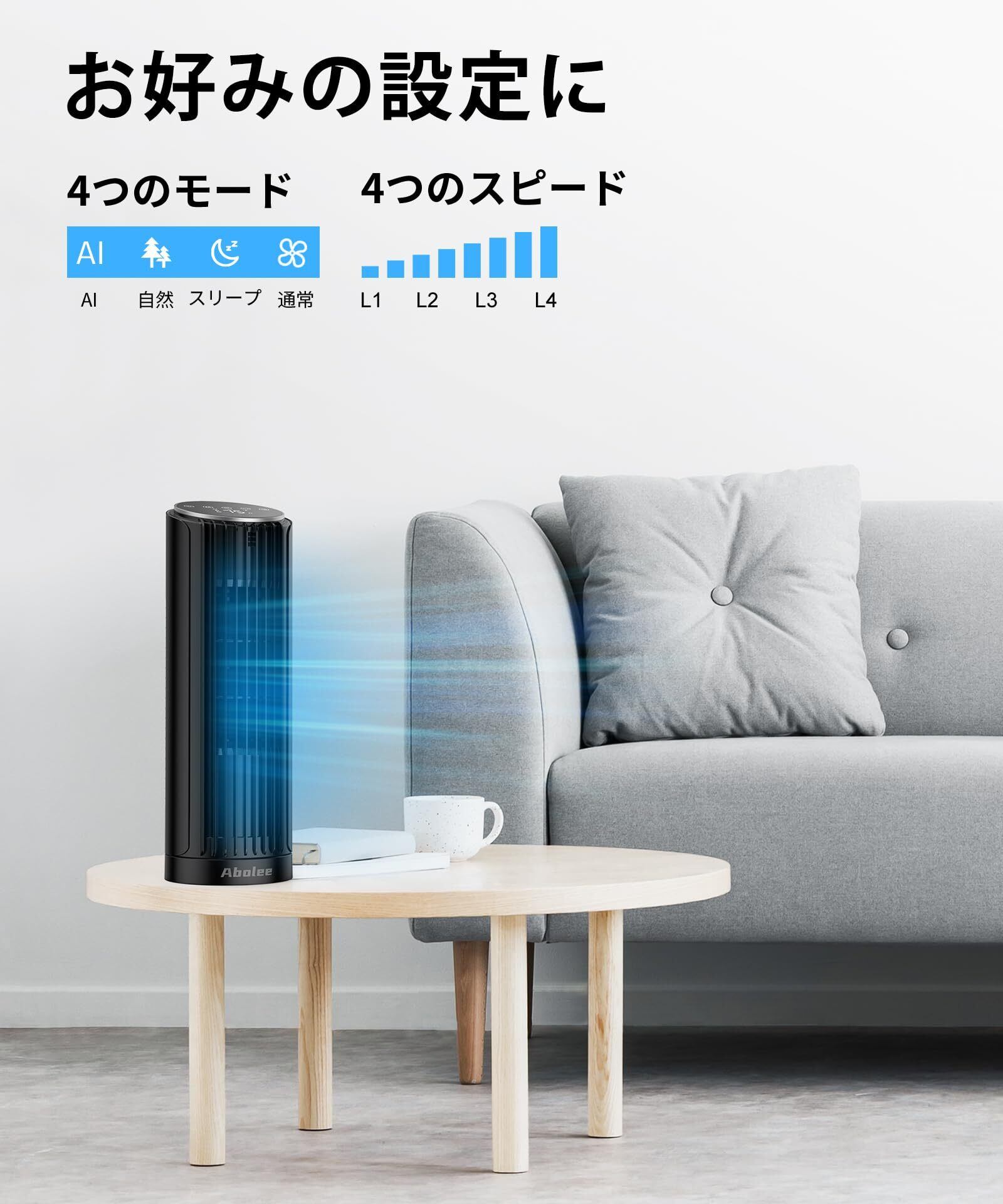 【お好みの設定に】Abolee扇風機は4つのモード(AI/通常/自然/スリープ)と4つのスピードが選択できます。このファンは70°首振り機能が付き、涼風を広く届けます。さらに、ミュートモードと12時間タイマーは、いつでも安眠できるように設計されています。