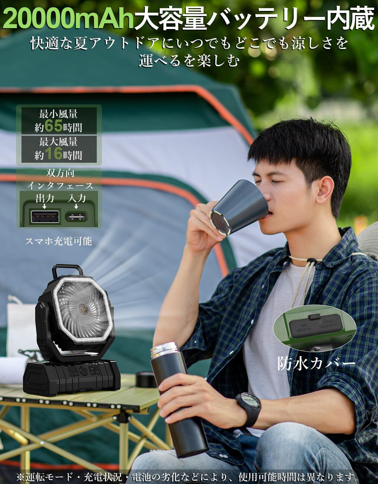 【20,000mAh充電池搭載&夏のキャンプ/外出のお供として】キャンプ 扇風機は20000mAhの超大容量リチウムイオン蓄電池を内蔵しています。フル充電の場合、最小モードで約65時間の連続使用ができます。最大モードで約16時間の連続使用ができます。使い方にもよりますが、1日中屋外にいても充電なしで利用できる。電池残量がすぐに確認できるLEDを搭載しています、タイムリーに電力補充を実現。コードレスの充電式扇風機なので気軽に持ち運べてどんな場所でも快適な風を楽しむことができます。週末や休日などのアウトドアには、熱中症対策や蚊などの虫よけ、イルミネーションなど、さまざまなシーンで活躍します。合、扇風機で最大65時間、LEDライトで最大200時間の航続が可能です。本体の上に吊り手がありますので、付属のカナビラを使用し、テントや室内の天井に直接吊るして吊り上げ扇風機として暑い夏を快適に。