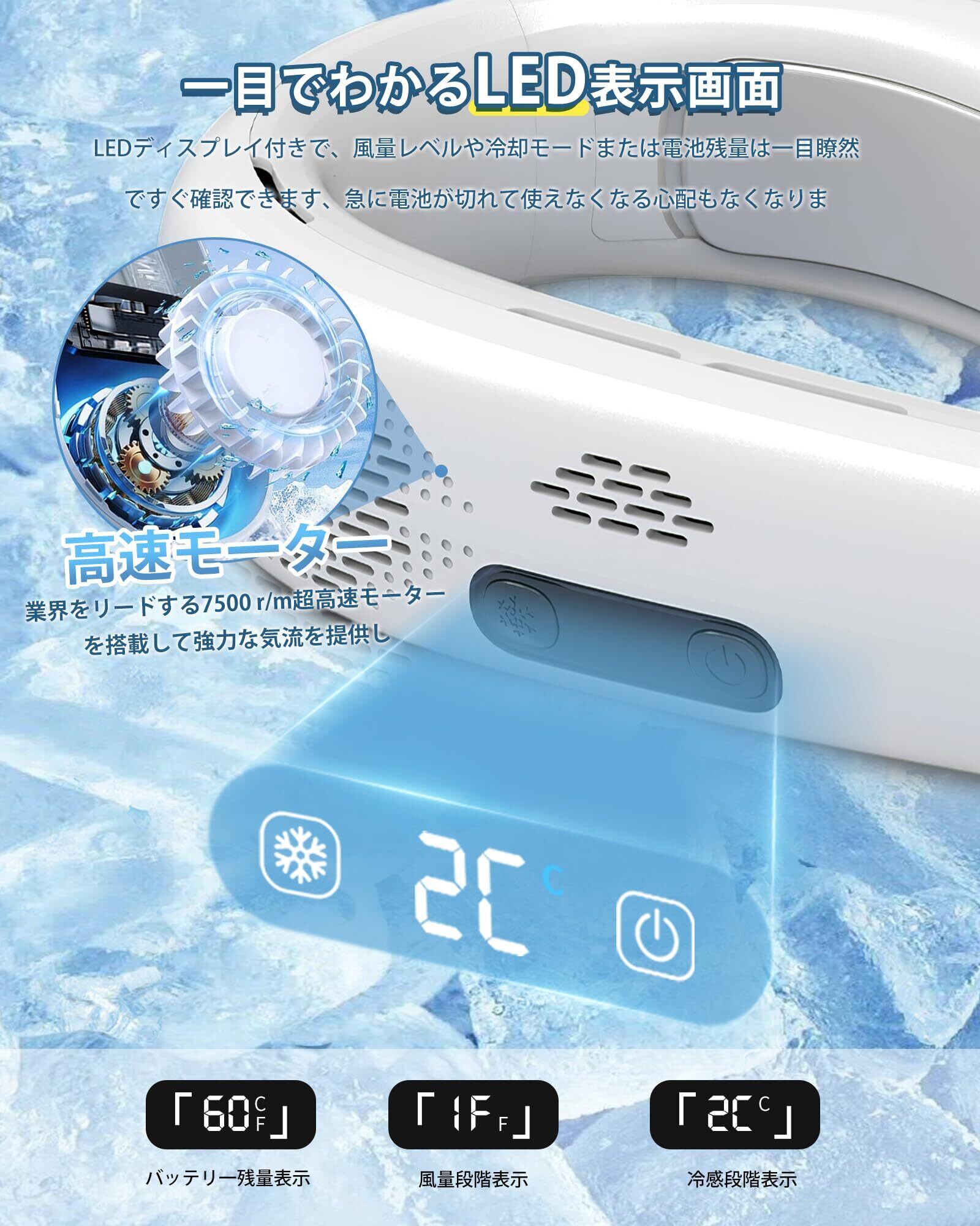 【瞬間冷却ネックファン&2025年夏新世代の冷却グッズ】新たに冷却機能を搭載した2025年最新の首掛けクーラー!製首かけ扇風機は独自設計によって高性能ダブルタービン&高風量静音ファンを採用、大風量を保ちながら静音運転を実現しました。新しいトレンドを導く半導体熱交換技術を採用し、上向きのファンで首周りや顔、首の裏などを立体的に冷却、首を効率よく冷やすことにより、1秒で肌に冷たさを伝え、体感温度が16℃下がります。暑い夏の日でもすぐに体温を下げ、快適な涼しさを提供する ネッククーラーです!夏の蒸し暑さを解消します。