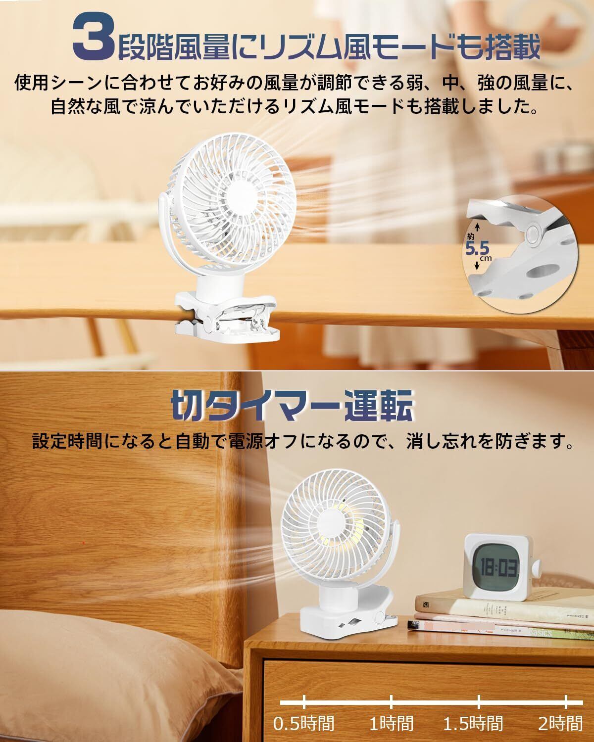 【左右360°自動首振り&10000mAh】 扇風機 クリップ usb充電式 風量3段階 リズム風 リモコン付き 切タイマー 小型 サーキュレーター LEDライト 強風 静音 卓上 車用 キャンプ 暑さ対策 ホワイト | kki