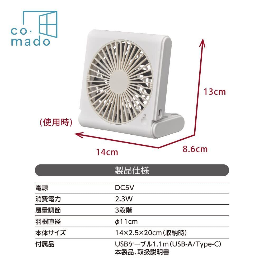 【マグネット付き】ドウシシャ 卓上扇風機 スリムコンパクトファン Multi 4電源(AC USB モバイルバッテリー 乾電池)風量3段階 角度4段階 静音 厚さ2.5㎝ ホワイト co.mado