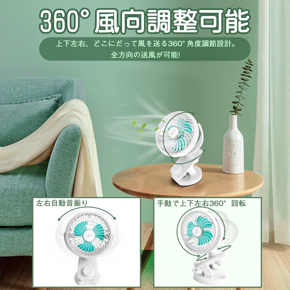 【自動首振り&5000mAh】 卓上扇風機 クリップ 小型扇風機 usb充電式 静音 風量無段階調節 360°角度調整 充電式扇風機 コードレス 最長60時間連続使用 強力 アロマ対応 オフィス 車 アウトドア 直径14.5cm ホワイト