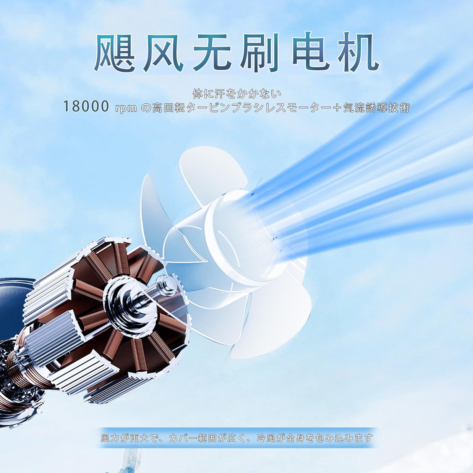 【4段階風量調節・低騒音ハンディファン】腰掛けファンは18000rpmの高回転タービンブラシレスモーターを搭載し、風力が強力で動作効率が高く、4段階の風量調節が可能です。ベルトファンは個人の好みに合わせて最も快適な風量を選択できます。さらに、独自のエアダクト設計と5枚のらせん状ファンプレートが風の送り距離を2倍にし、風速を通常の製品よりも数倍高めます。快適な強力な風を提供し、効果的に温度を下げます。
