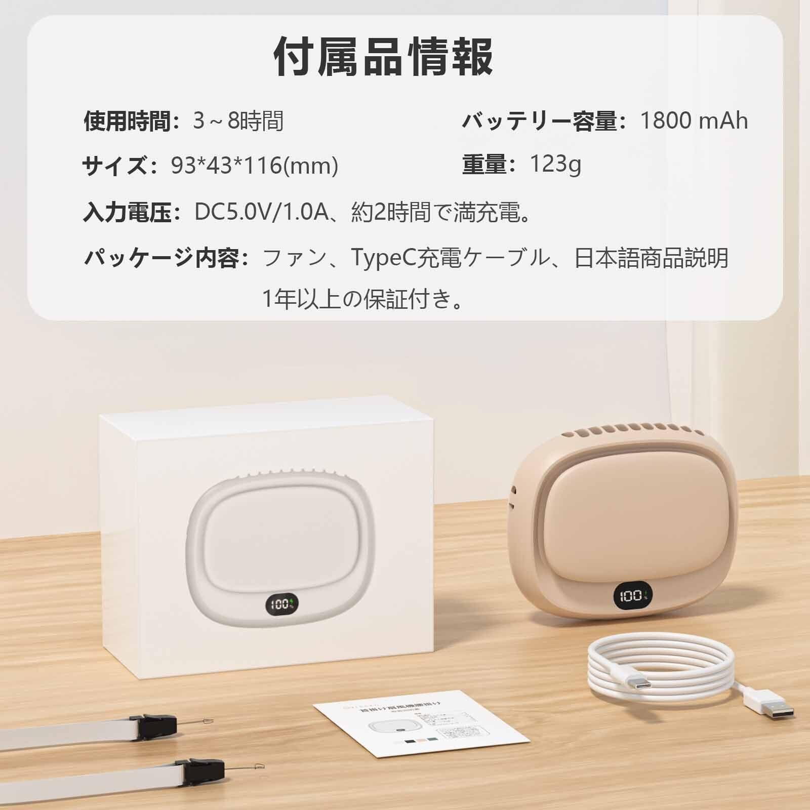 【幅広い使用・12ヶ月間安心】パッケージ:扇風機本体*1 、首掛け用ロープ*1、USB-A to Type-C充電ケーブル*1、取扱説明書*1。購入後1年間の付きで、初めての方でも安心してお試しいただけます。