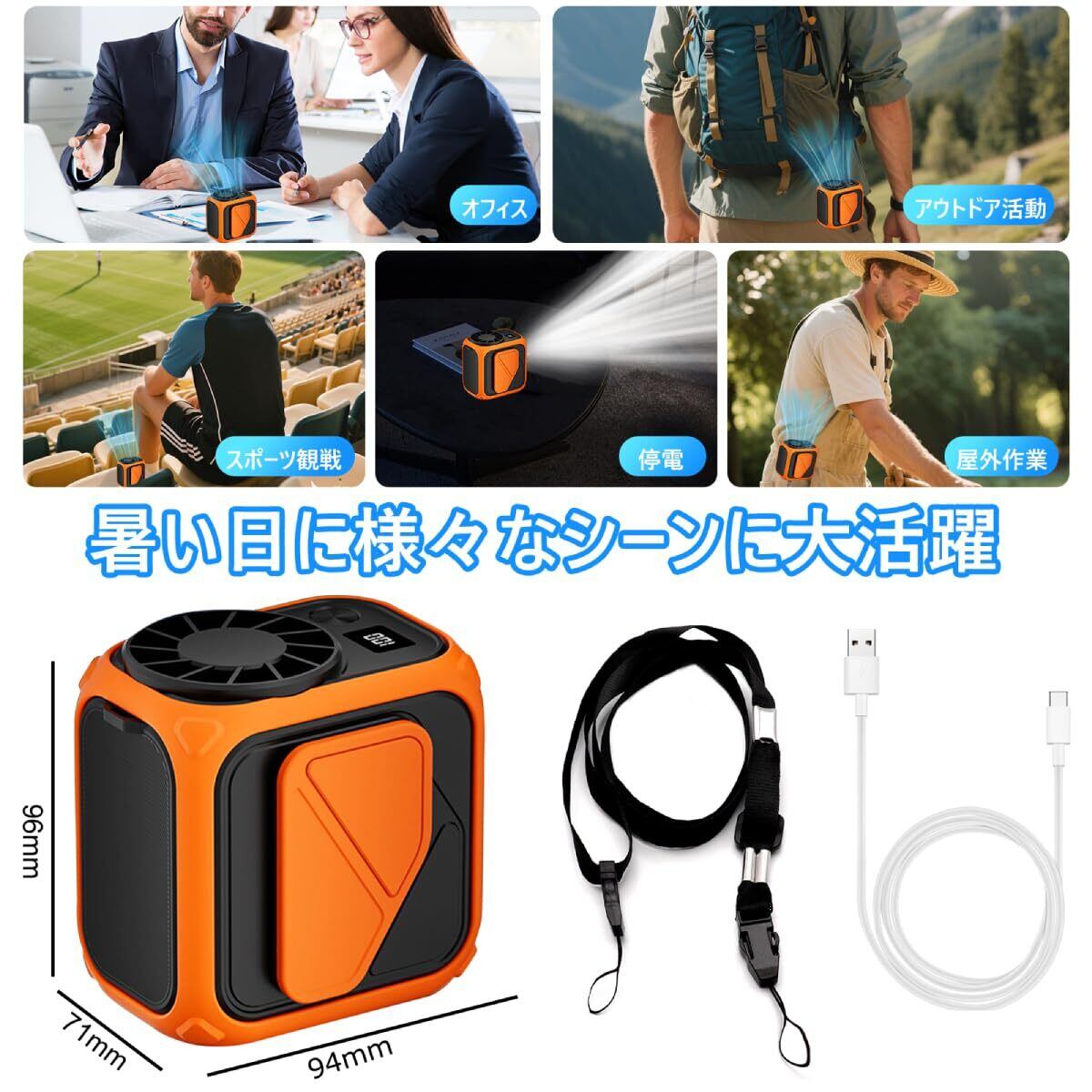 【様々なシーンで活躍・熱中症対策】スタイリッシュな外観で運動会、スポーツ観戦、散歩、通勤、花火大会やお祭り、旅行などさまざまな場面で大活躍です。工事現場、宅急配送、農業、工場、倉庫、キッチンなど高温度でエアコンが付けにくい作業場所にも使われる。