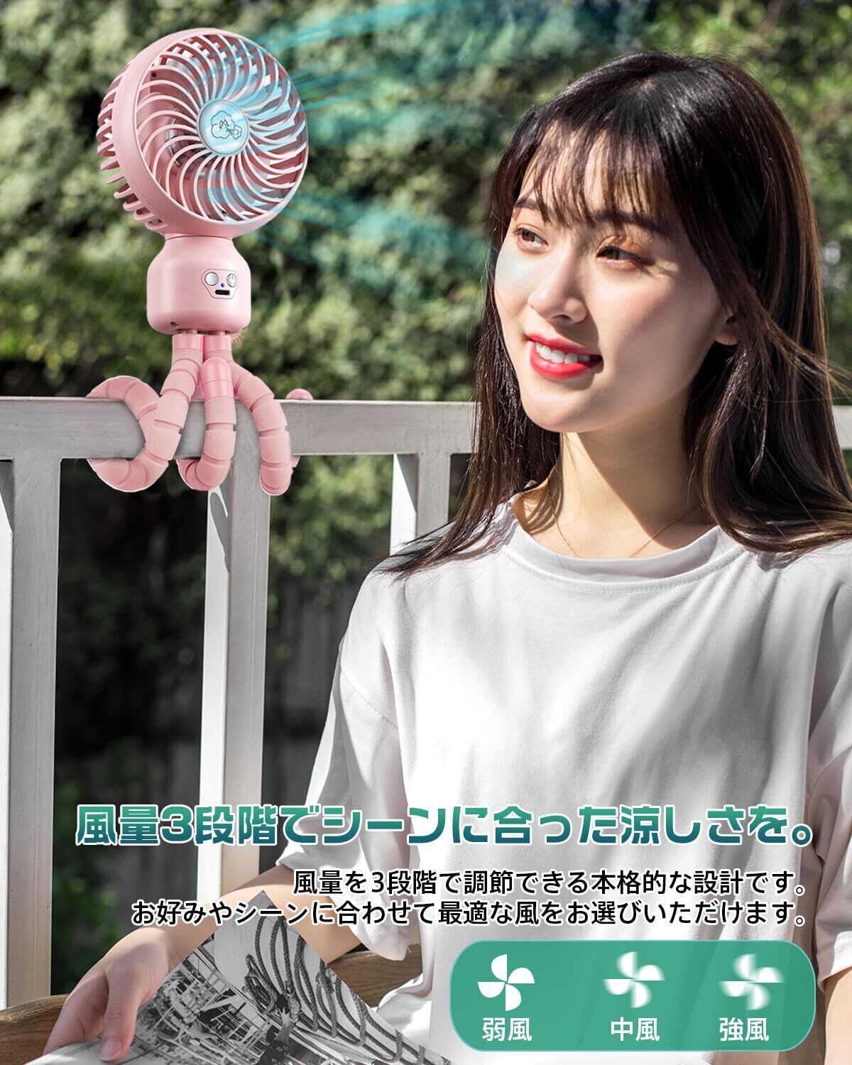 【自動首振り&巻き付き自由自在】携帯扇風機 充電式 小型扇風機 ミニ usb扇風機 4wayデザイン コードレス 静音 軽量 風量3段階調節 ポータブル アウトドア 暑さ/熱中症対策 ピンク | kki