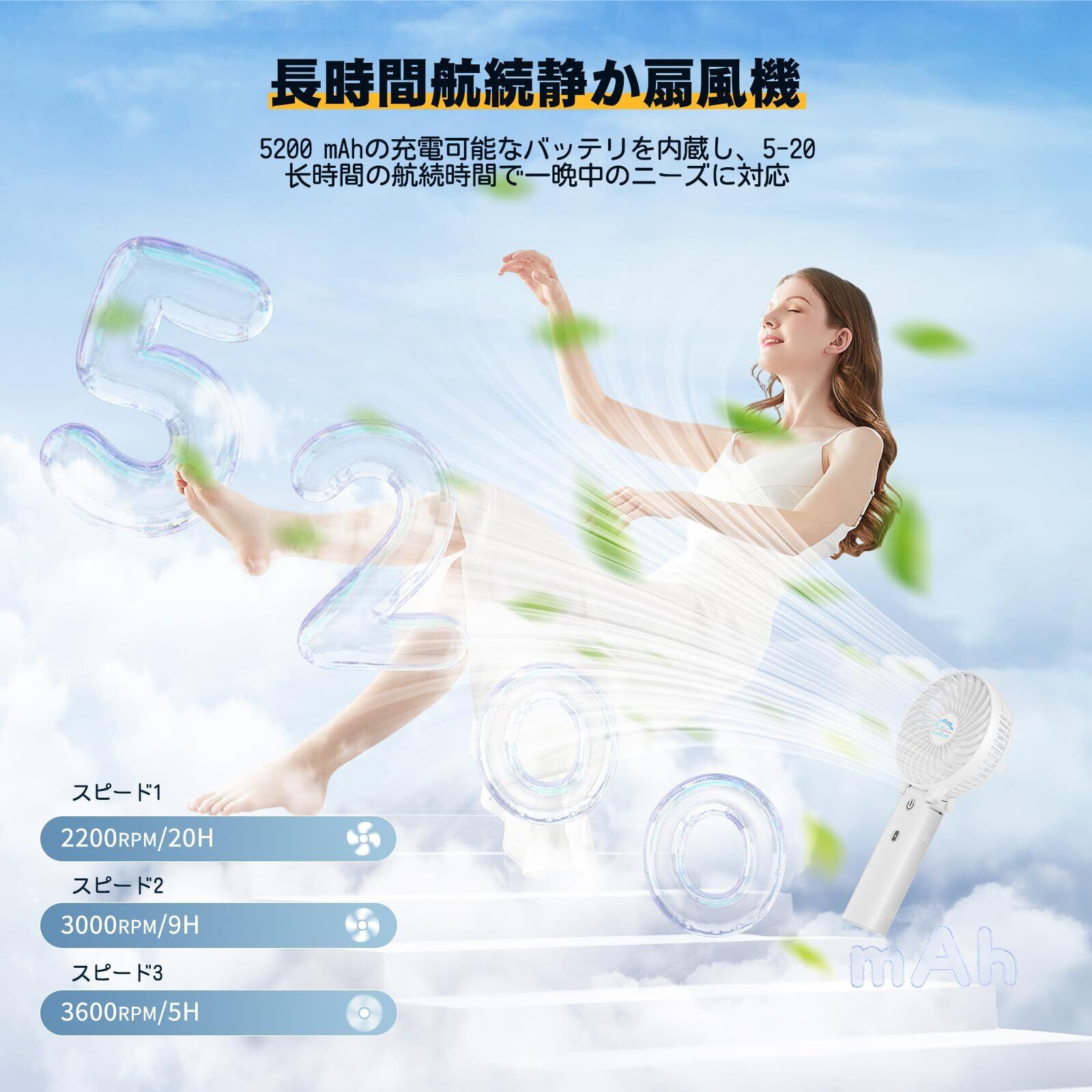 【5200mAh電池内蔵 モバイルバッテリーにも変身可能】PSE認定された5200mAh電池内蔵なので、フル充電と最小モードの場合には、最長稼動時間が19時間までに至る。携帯扇風機の電源としてだけではなく、モバイルバッテリーにも変身可能。消費電力はただ4Wなので、この夏に、この一本のハンディファンで、心地よい風を楽しめる、そして節エネ・コストも実現可能。在宅や出かけるや停電などの時、いつでもどこでも手軽く心地よい風を楽しめる。電源表示のランプが扇風機の正面にある、電源の残量が一目で分かりやすい。