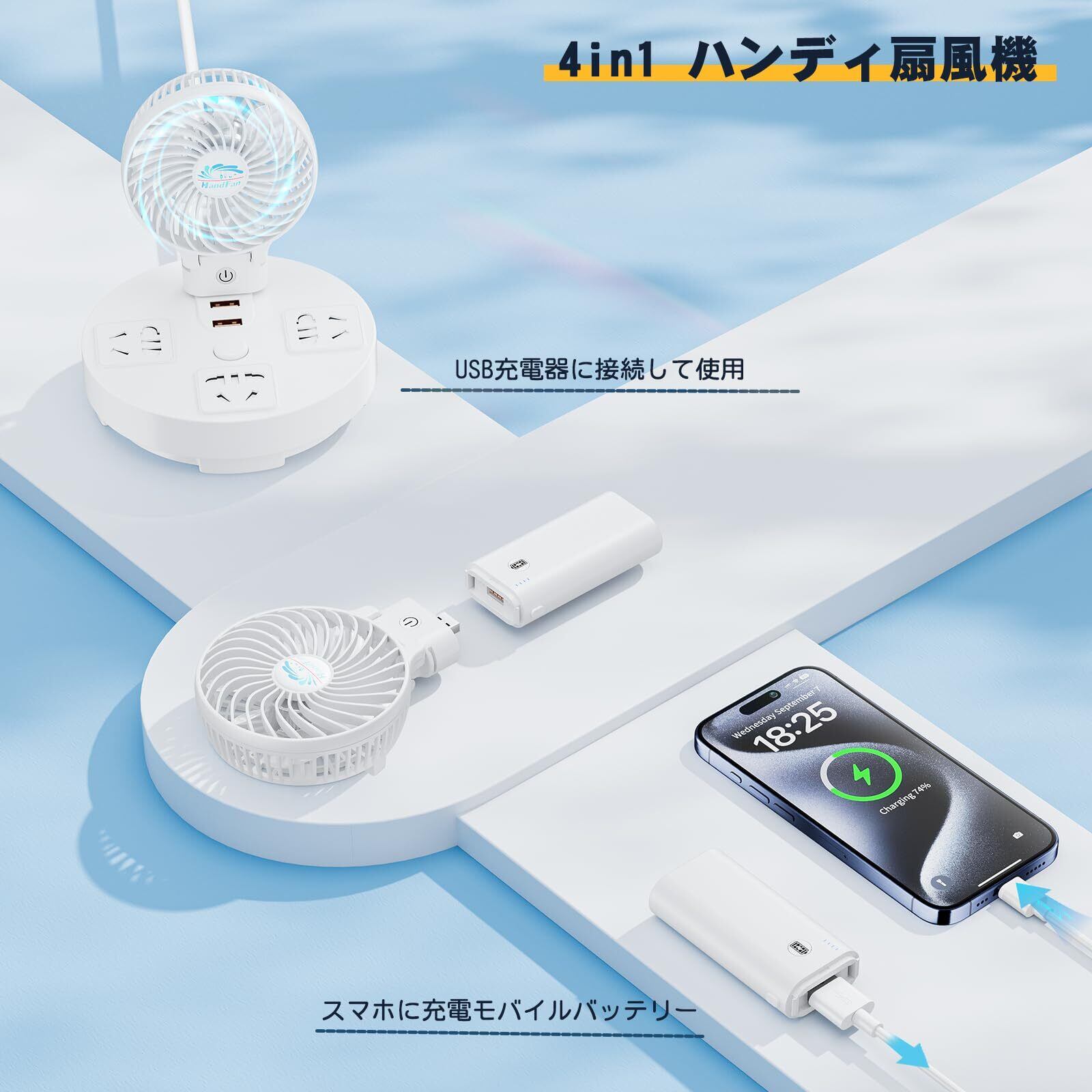 HandFan 携帯扇風機 5200mAhモバイルバッテリー ハンディファン 20dB静音 手持ち扇風機 小型 卓上扇風機 クリップ 扇風機 6枚羽根 180°り畳み式 持ち運びに便利 熱中症 暑さ対策 USB-C ケーブル付属