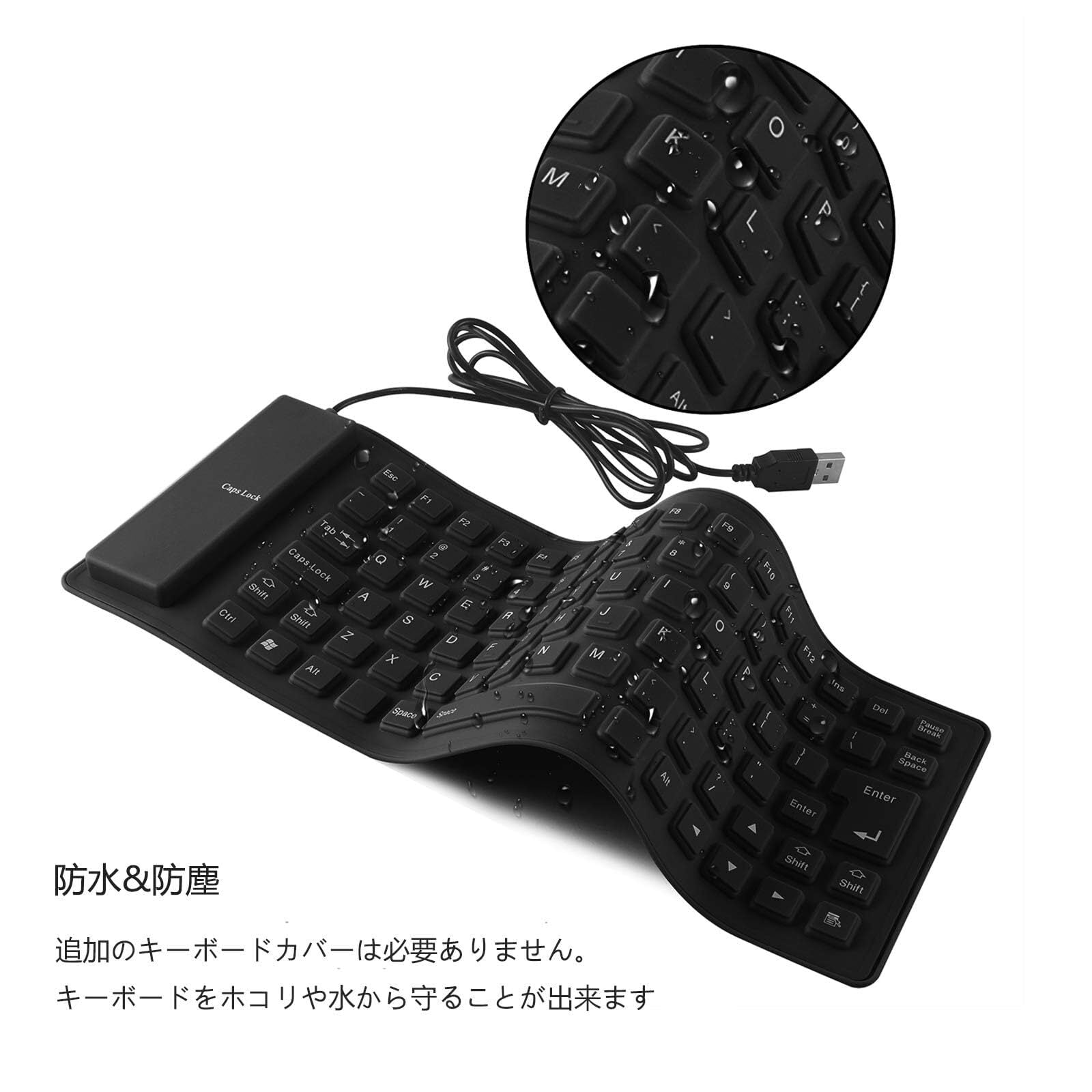【防水&防塵】液体の侵入を防ぐ密封設計。キーボードにジュースやコーヒーがこぼれても、湿らせたタオルでふき取れます。お手入れ簡単、汚れても丸洗いできます。USBコネクタ部分だけを水洗しないように注意してください。