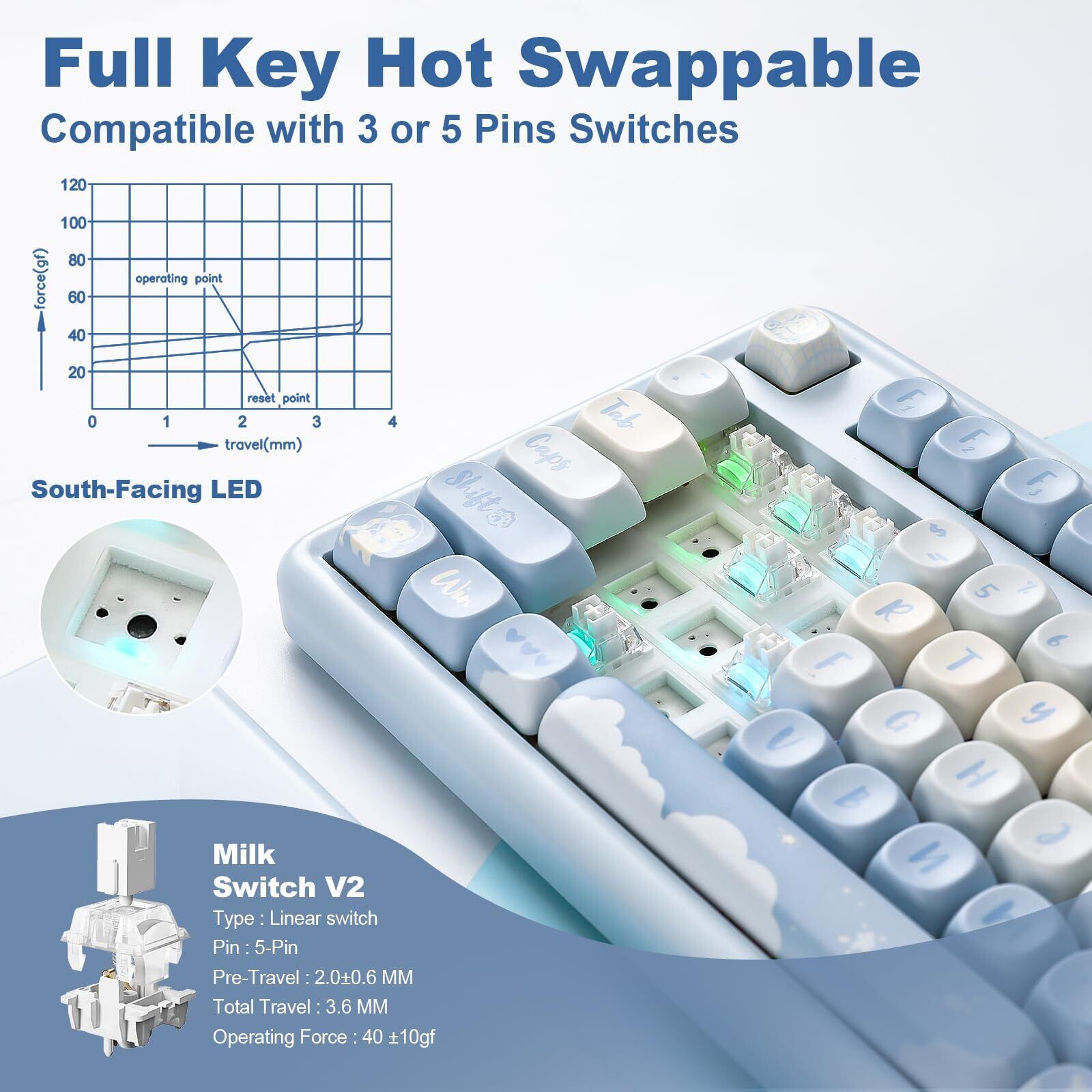 YUNZII B87 ワイヤレスメカニカルキーボード ゲーミングキーボード BT5.0/2.4G/USB-C NKRO QMK/VIAソフトウェアカスタム MOAキーキャップ ガスケット RGB リストレスト Win/Mac用 技適認証取得 (ブルー, ミルクV2スイッチ)