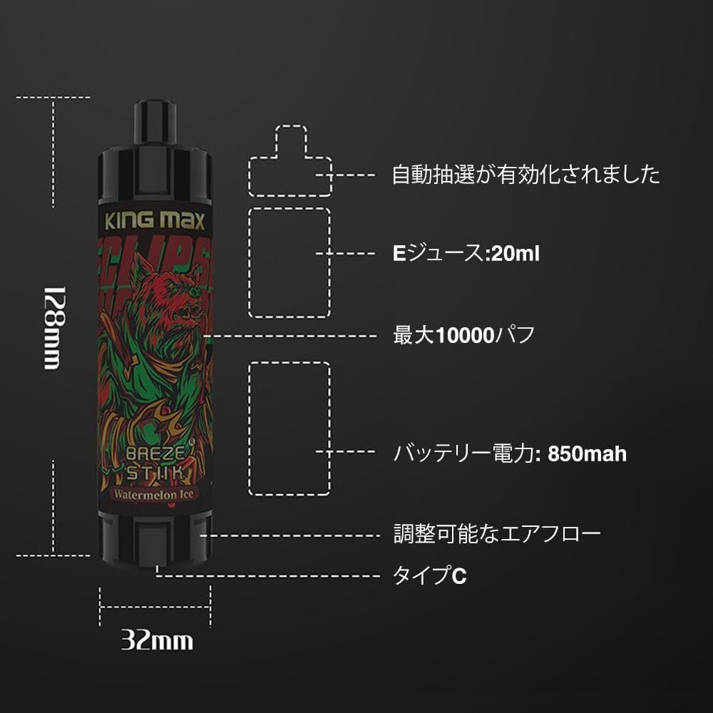 使い捨て電子タバコ Breze Stiik King Max 10000回吸引 20ml 大容量シーシャリキッド VAPE 持ち運び シーシャ Type-C充電 爆煙 ペン型 ニコチンゼロ タールなし 水蒸気タバコ (ブルーベリー ラズベリー) | kki