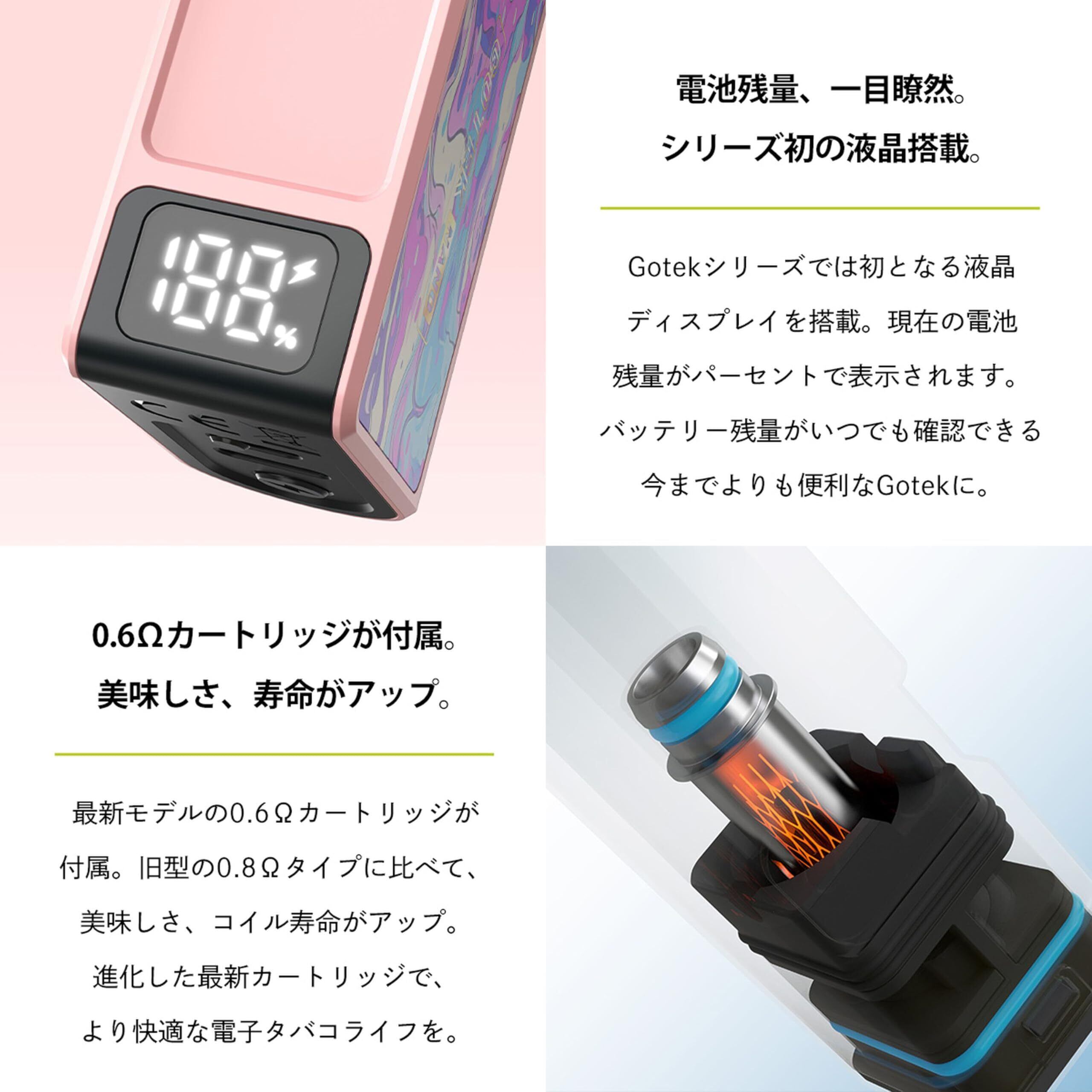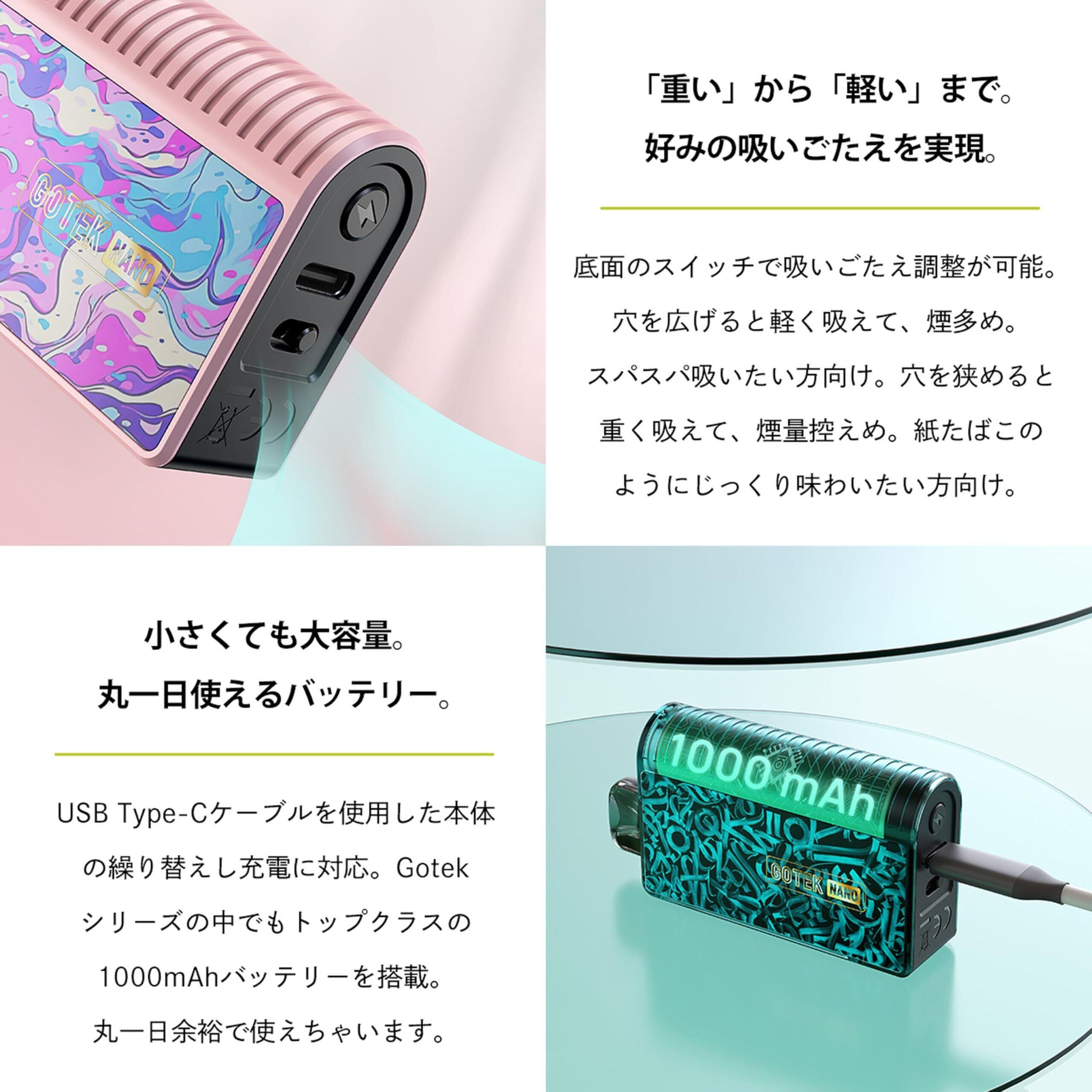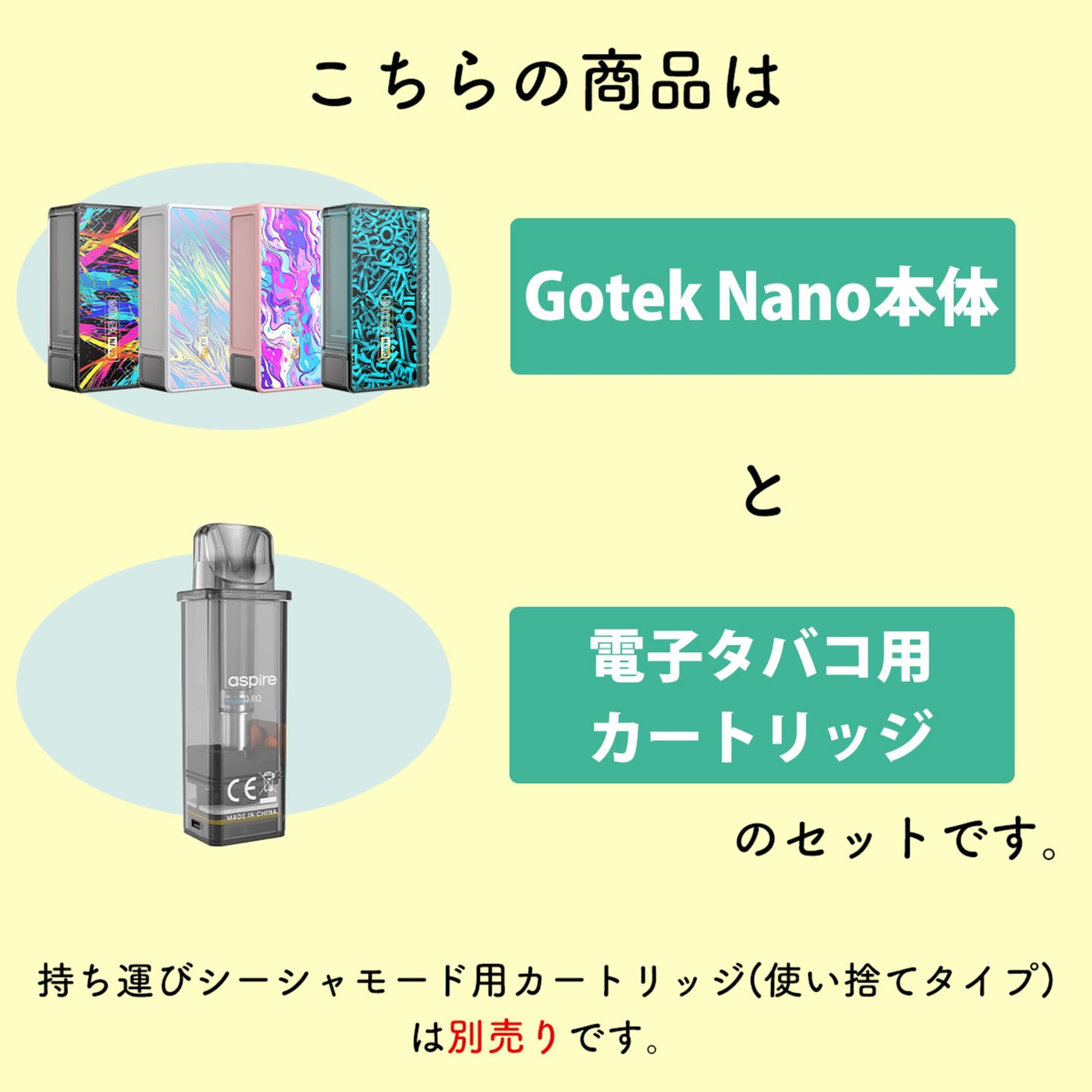 Aspire(アスパイア)の人気シリーズGOTEK(ゴーテック)から、GOTEK Nano(ゴーテック ナノ)が登場。バッテリー容量が見やすいデジタルインジケーターを搭載し、さらに進化しました! 従来モデルのGOTEK XやGOTEK Sは650mAhのバッテリー容量でしたが、GOTEK Nanoは1000mAhにパワーアップ。外出先でも充電切れの心配なく、安心して使えます。軽量でコンパクトなデザインで、本体素材には衝撃強度に優れたPCT-G樹脂を使用し、耐久性も抜群です。 2Way仕様のPOD型VAPEで、空カートリッジにお好みのリキッドを注入する「電子タバコタイプ」と、別売りのリキッド充填済みカートリッジを使う「持ち運びシーシャタイプ」の両方を楽しめます。空カートリッジは5回~10回繰り返し使用可能で、コスパも最高。GOTEKカートリッジの濃厚なフレーバーはディスポーザブル製品(持ち運びシーシャ)とは一線を画します。 この機会に、進化したGOTEK Nanoで快適なVAPEライフをお楽しみください。