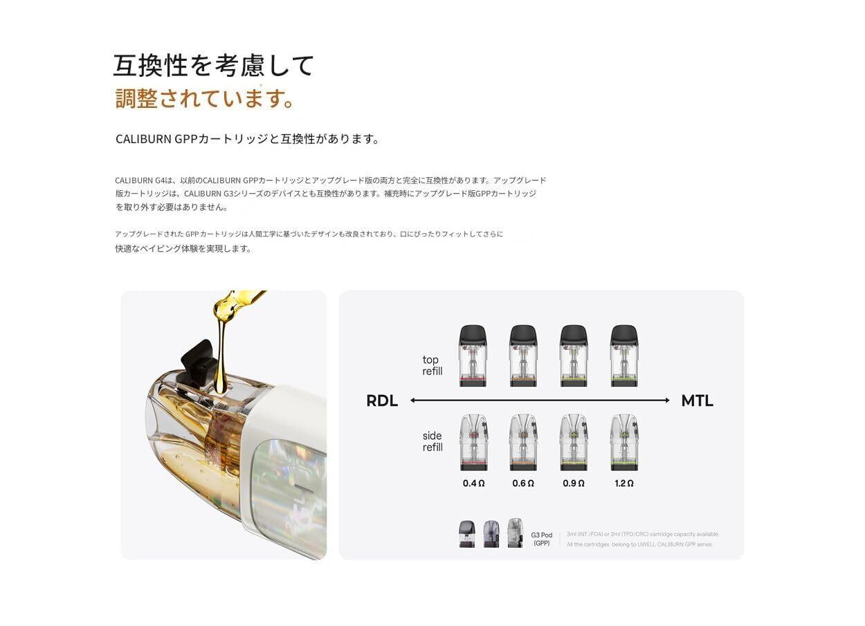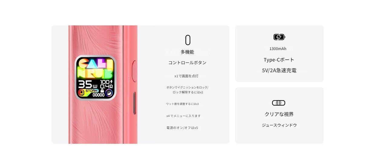 「セット内容」 Caliburn G4 本体 ×1 GPPポッドカートリッジ 0.6Ω(3mL)×1 GPPポッドカートリッジ 0.9Ω(3mL)×1 Type‑C 充電ケーブル ×1 ユーザーマニュアル ×1 meihenベイプバンド x 1