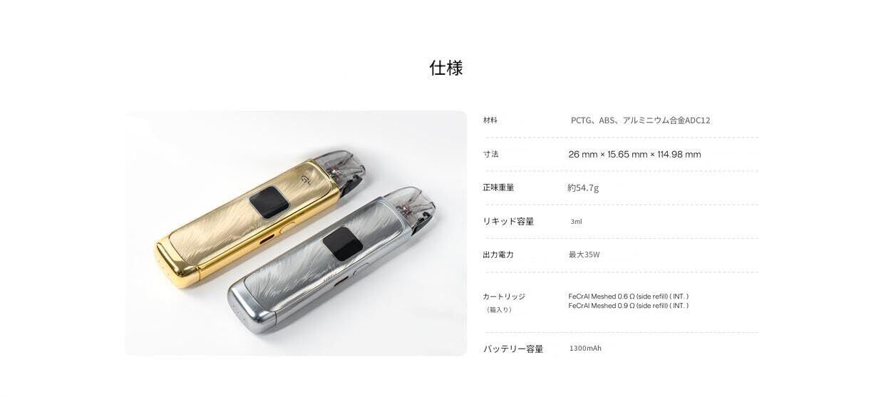 「商品詳細」 本体サイズ:114.98 × 26 × 15.65 mm 本体重量:約65g バッテリー容量:1300mAh 出力範囲:1~35W リキッド容量:3.0mL(サイドフィル) 対応抵抗値:0.3Ω~3.0Ω 充電ポート:Type‑C(最大1.5A) 材質:PCTG、ABS、ADC12アルミニウム合金