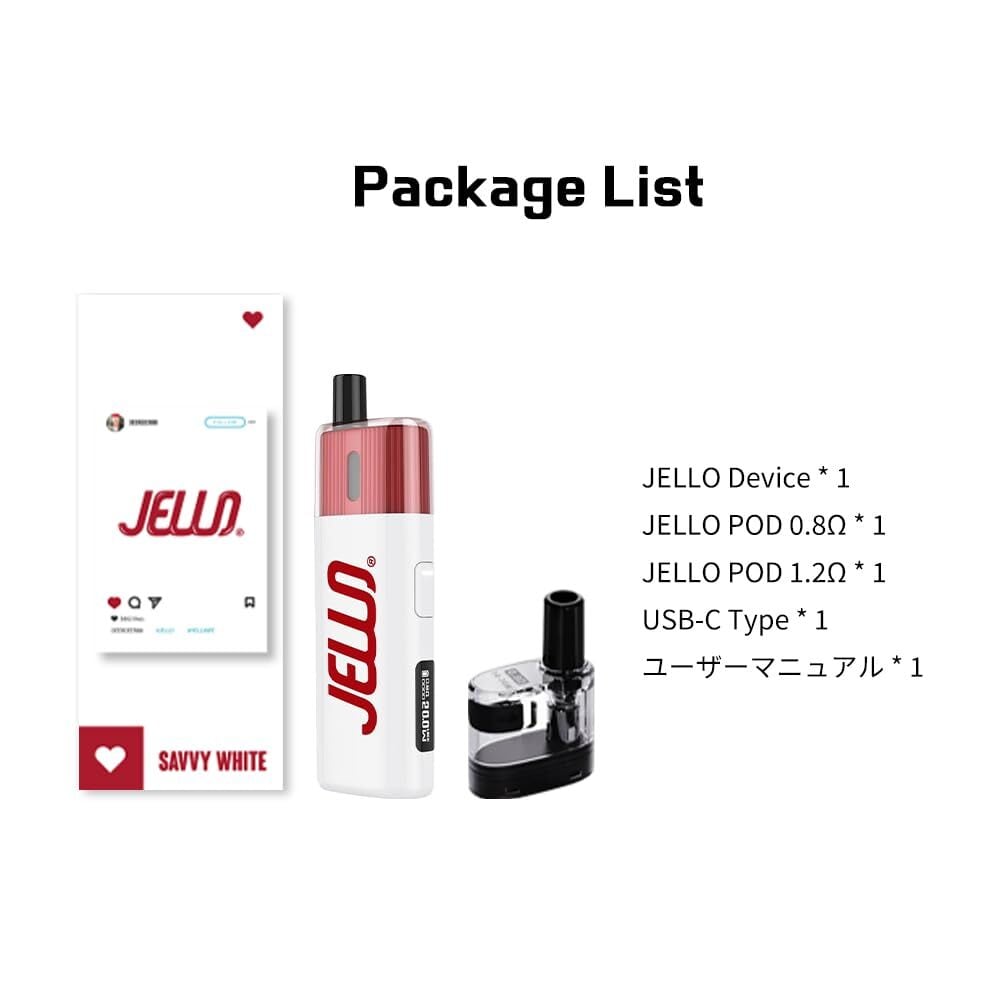 [Specificarions] Size: 4.06 x 1.32 x 0.7 inches (103.25 x 33.50 x 18.00 mm) Pod Capacity: 3mL Battery Capacity: 1500mAh Adjustable Power: 5-20W Charging: Type-C, 5V/1A Net Weight: 64g [Cartridge] · Jello 0.8Ω Cartridge (14-16W) · Jello 1.2Ω Cartridge (10-12W) · Jello Boost 0.8Ω Cartridge (17-19W) [Standard Edition Contents] Jello Device x1 Jello 0.8Ω Cartridge(3ml) x1 Jello 1.2Ω Cartridge(3ml) x1 Type-C Cable x1 User Manual & Warranty Card x1