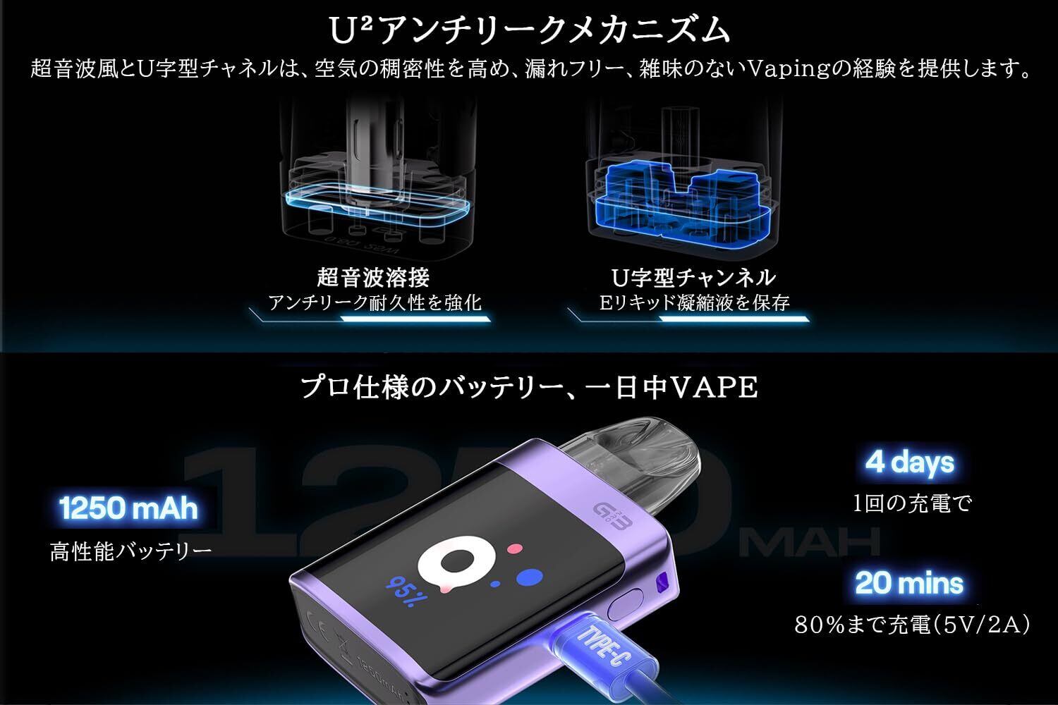 3、内蔵充電式バッテリー:Caliburn G3 Pro KOKOは1250mAhのバッテリーを内蔵しています。1 回の充電で最大 4 日間の vaping をサポートし、長時間の使用に最適です。